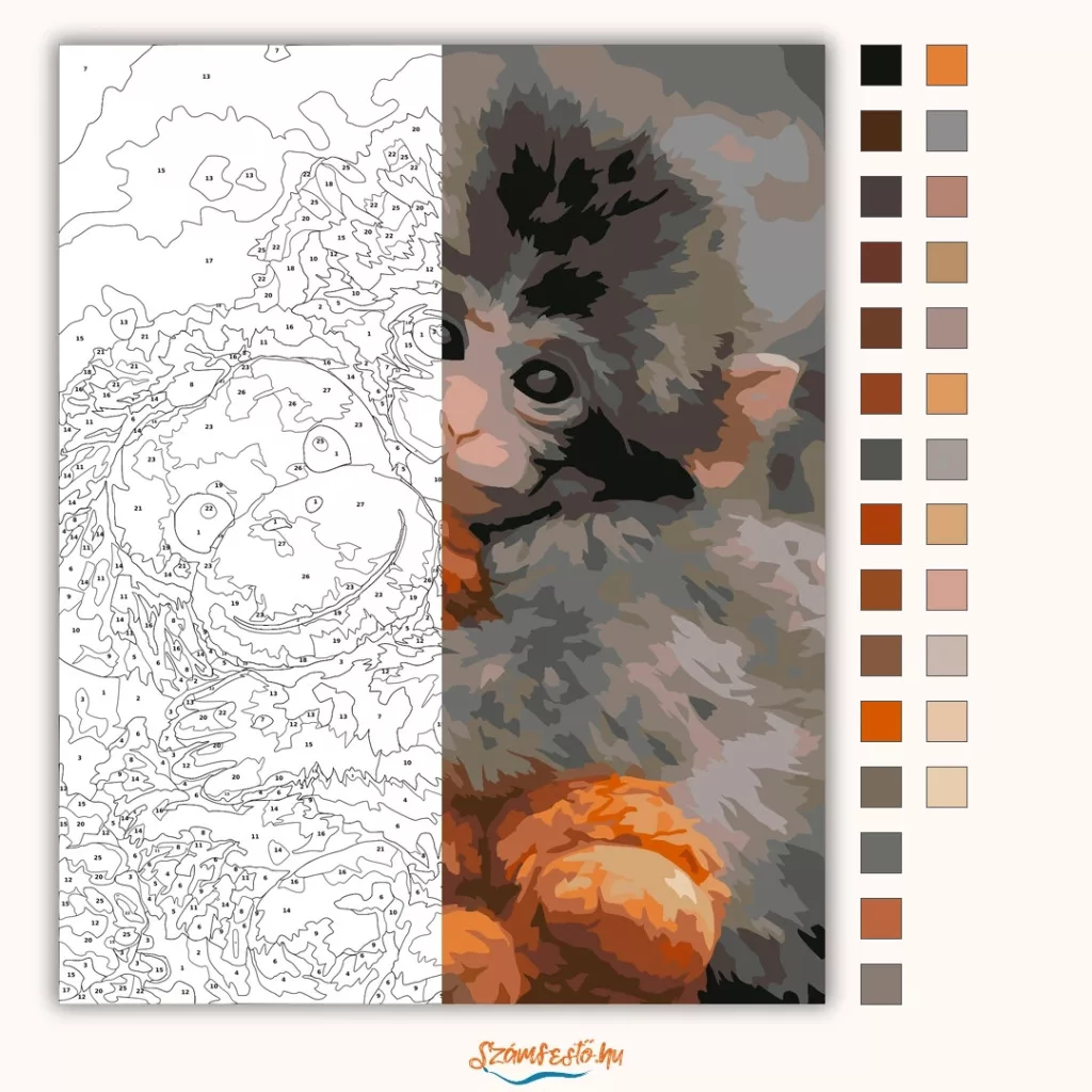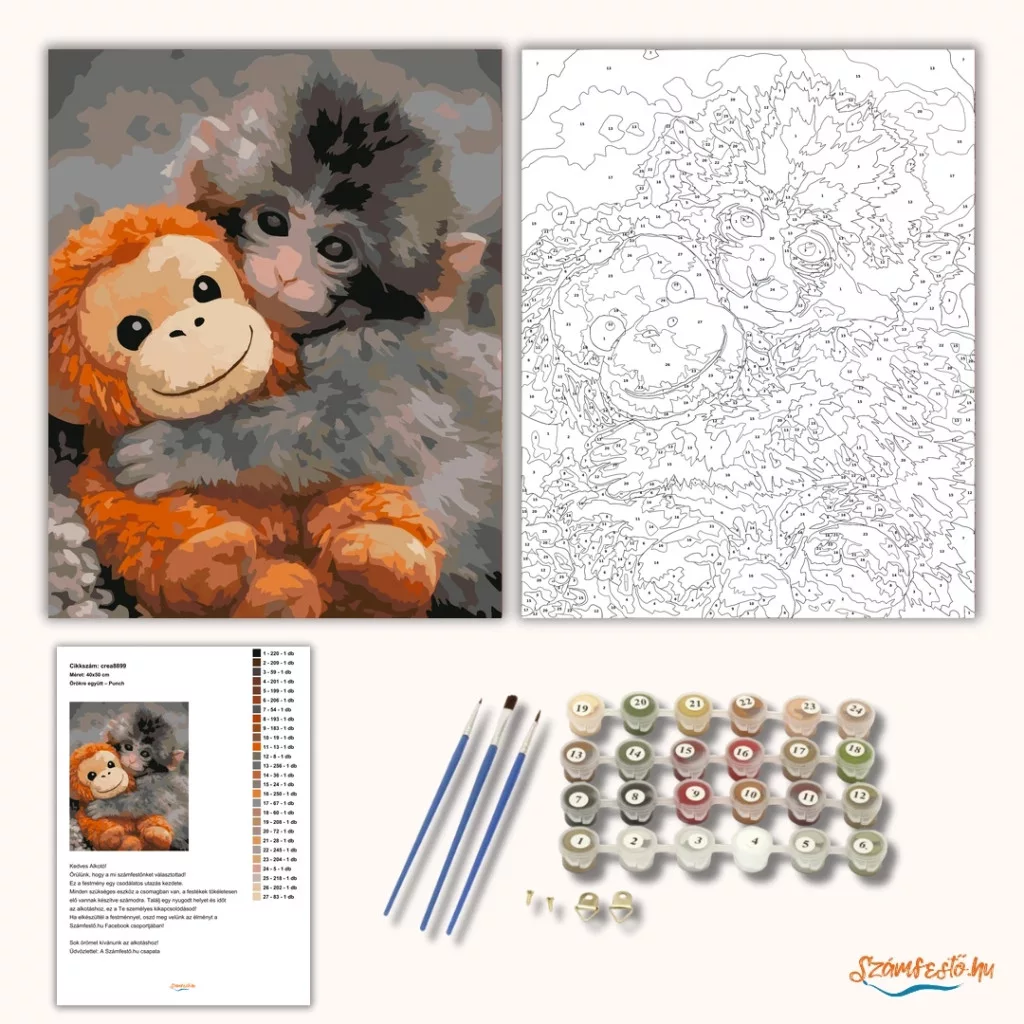 A festmény egy bensőséges közeli pillanatot örökít meg: Punch gyengéden a narancsszínű plüssmajomhoz simul, apró karjaival szorosan átölelve azt. A kölyök nagy, mélybarna szemei egyszerre tükröznek sebezhetőséget és megnyugvást, míg a plüss játék mosolya kontrasztként stabil, állandó jelenlétet sugall. A lágy szürke háttér kiemeli a meleg barna és narancs árnyalatokat, így a kép teljes fókusza a kötődésre és a biztonság érzésére irányul. Ez az a jelenet, amely világszerte milliókat érintett meg: egy apró lélek, aki egy plüssfigurában találta meg a saját kis világát és vigaszát. Díszítsd otthonodat saját kézzel készített műalkotással, vagy ajándékozd meg szeretteidet egy igazán különleges élménnyel! A számfestő készletben minden szükséges eszköz megtalálható a festmény elkészítéséhez.