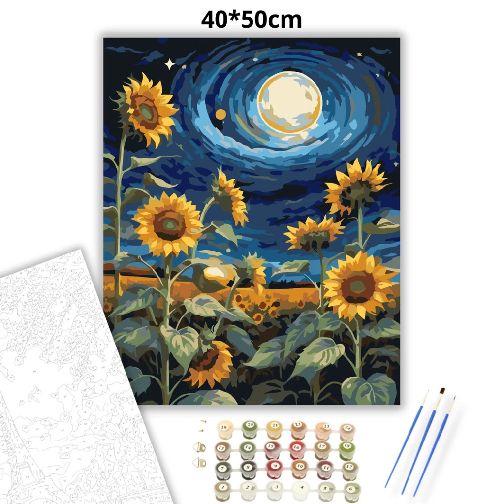 A képen napraforgók láthatók egy sötét, örvénylő éjszakai ég alatt. Középen egy fényes hold ragyog, körülötte csillagokkal. A meleg sárga virágok és a mély kék ég kontrasztja különleges, álomszerű hangulatot ad. Engedd szabadjára a kreativitásodat, és alkoss egy különleges műalkotást, amely otthonod dísze lehet de egyedi ajándékként is kiváló. A számfestő készletben minden szükséges eszközt megtalálsz a tökéletes végeredményhez.