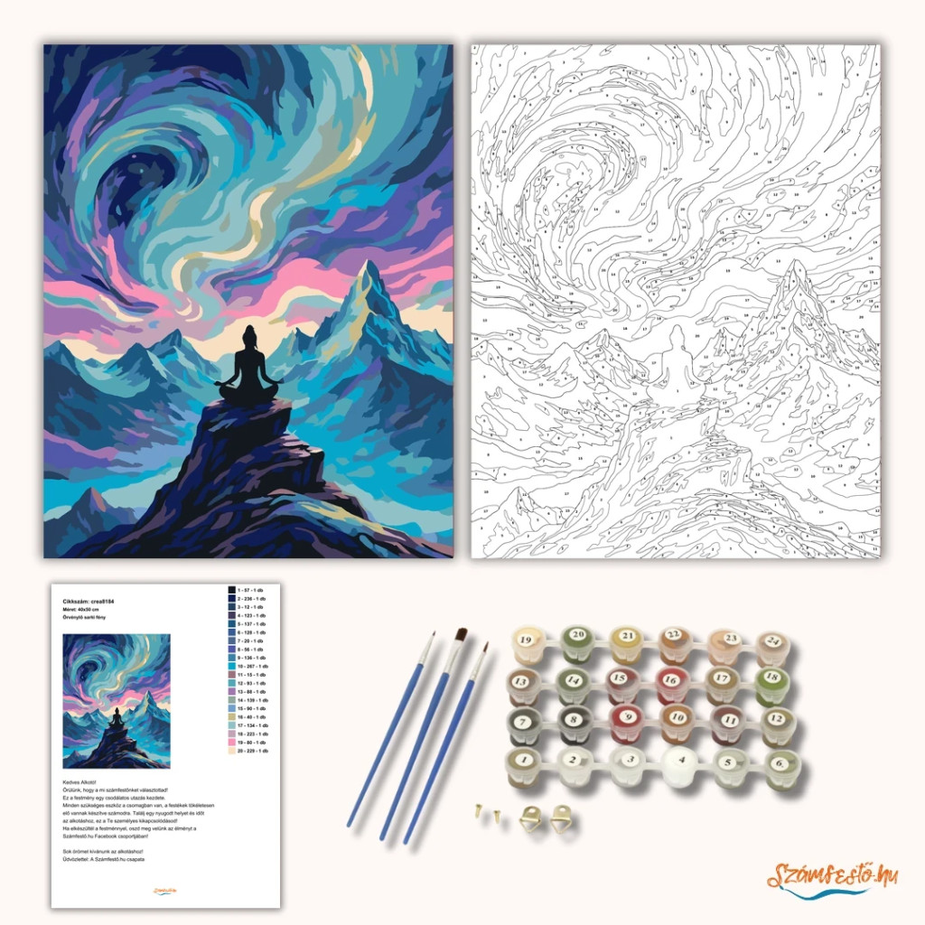 • Festékek: Bőségesen elegendő, kiváló minőségű akril festékek minden szükséges színhez. A színek jól fednek, gyorsan száradnak, nem igényelnek keverést.