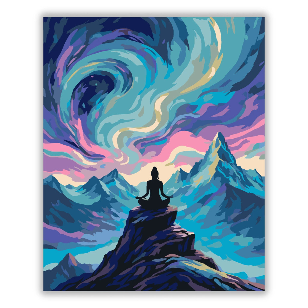 A képen egy ülő ember sziluettje látható egy sziklacsúcson, körülötte hegyekkel. Az égbolton örvénylő, hullámzó fények kavarognak türkiz, lila és rózsaszín árnyalatokban. Az összhatás nyugodt, mégis látványos, mintha a természet ereje venné körül az alakot.