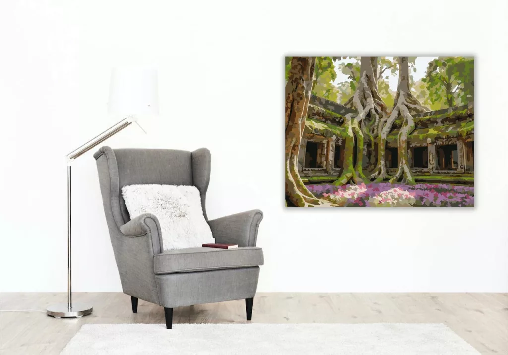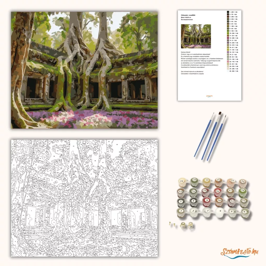A képen ősi templomromok láthatók, amelyeket egy hatalmas fa vastag gyökerei és törzse szorosan körbeölelnek. A kőoszlopok és sötét nyílások között zöld moha és lomb árnyéka ad titokzatos, nyugodt hangulatot. Elöl egy virágos, rózsaszínes-lilás szőnyeg teszi még különlegesebbé a látványt. Engedd szabadjára a kreativitásodat, és alkoss egy különleges műalkotást, amely otthonod dísze lehet de egyedi ajándékként is kiváló. A számfestő készletben minden szükséges eszközt megtalálsz a tökéletes végeredményhez.
