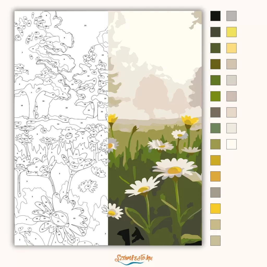 A képen tavaszi, virágzó rét látható hajnalban, finom ködbe burkolózva. Előtérben margaréták és sárga mezei virágok nyílnak a zöld fűben, a háttérben pedig a fák halvány sziluettjei tűnnek fel a párában. A látvány nyugodt, friss és természetközeli hangulatot áraszt. Legyen a lakásod dísze vagy egy kedves meglepetés valaki számára – ez a számfestő készlet tökéletes választás mindkettőre. A készletben mindent megtalálsz, amivel lépésről lépésre megalkotható ez a gyönyörű festmény.