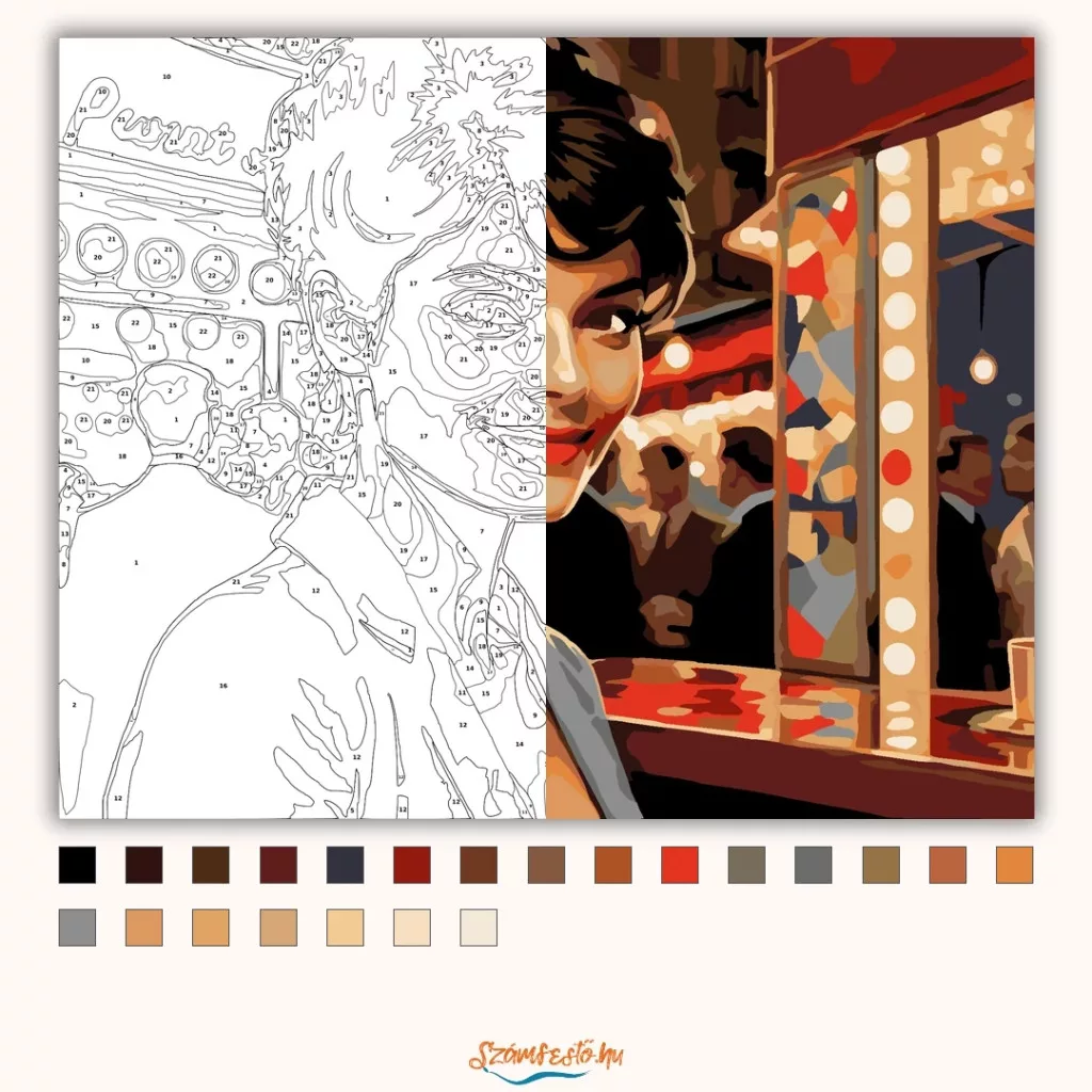 A képen Amélie áll egy párizsi kávézó meghitt fényében, a fotóautomata mellett, finom, játékos mosollyal. A háttér meleg, aranyló fényekkel és nyüzsgő élettel telik meg, mégis intim hangulatot áraszt. A jelenet könnyed, álomszerű atmoszférát sugároz, tele apró örömökkel és csendes varázslattal. Díszítsd otthonodat saját kézzel készített műalkotással, vagy ajándékozd meg szeretteidet egy igazán különleges élménnyel! A számfestő készletben minden szükséges eszköz megtalálható a festmény elkészítéséhez.