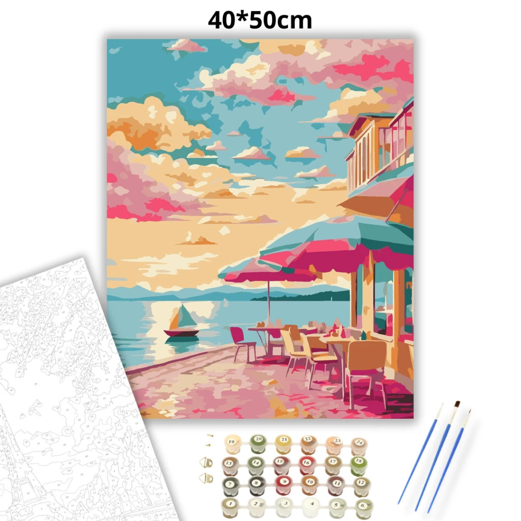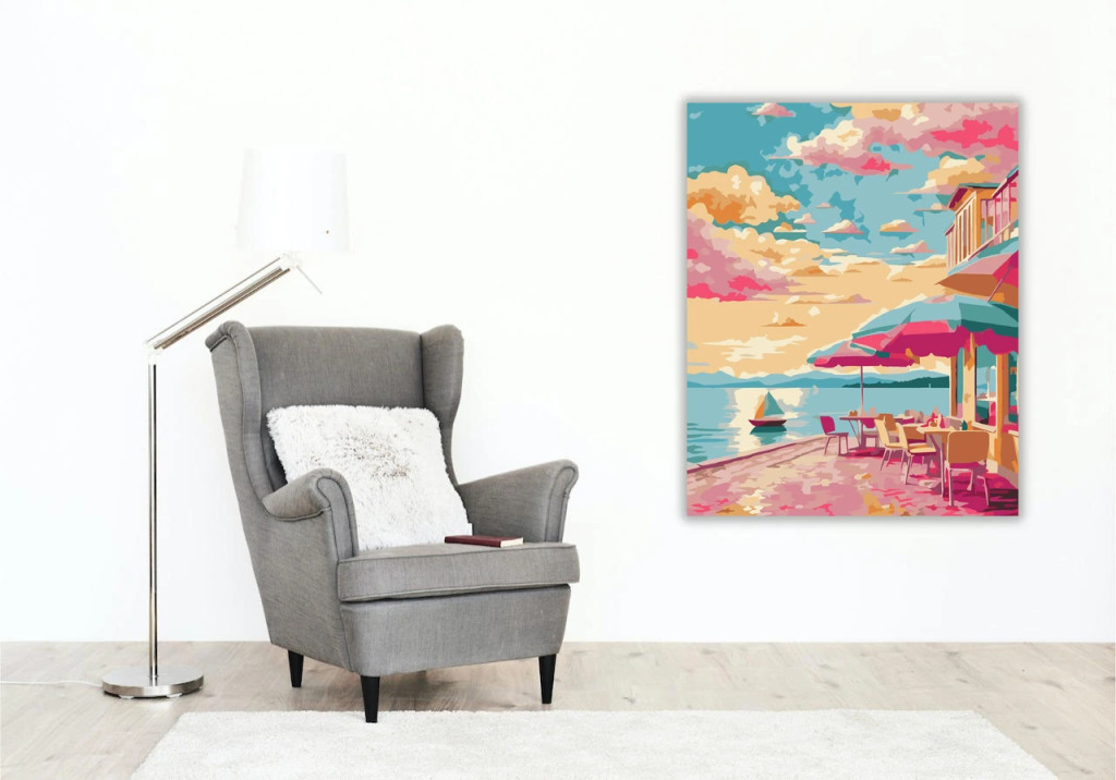 Pasztel tengerparti terasz - számfestő készlet - Számfestő.hu - 40×50cm - Keretre feszítve