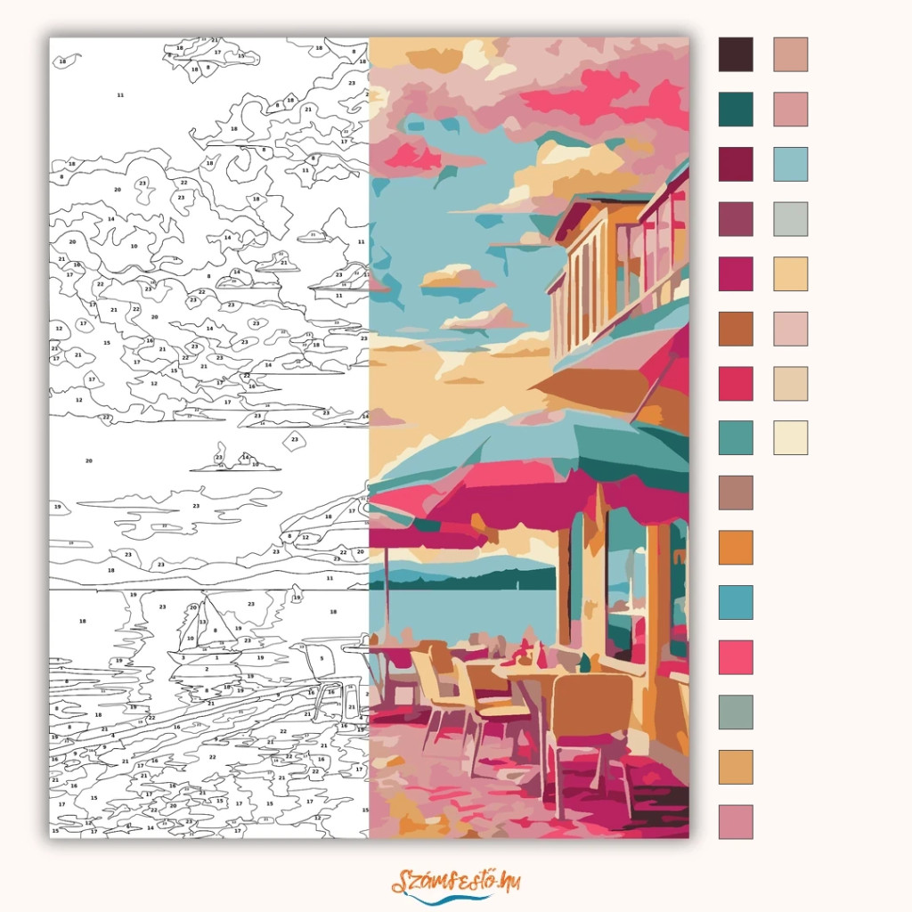 A képen egy vízparti sétány látható teraszos asztalokkal és napernyőkkel, a part mellett nyugodt víztükörrel. A távolban egy kis vitorlás halad, a háttérben alacsony hegyvonulat rajzolódik ki. A látványt nagy, színes felhők és meleg fények teszik hangulatossá. Engedd szabadjára a kreativitásodat, és alkoss egy különleges műalkotást, amely otthonod dísze lehet de egyedi ajándékként is kiváló. A számfestő készletben minden szükséges eszközt megtalálsz a tökéletes végeredményhez.