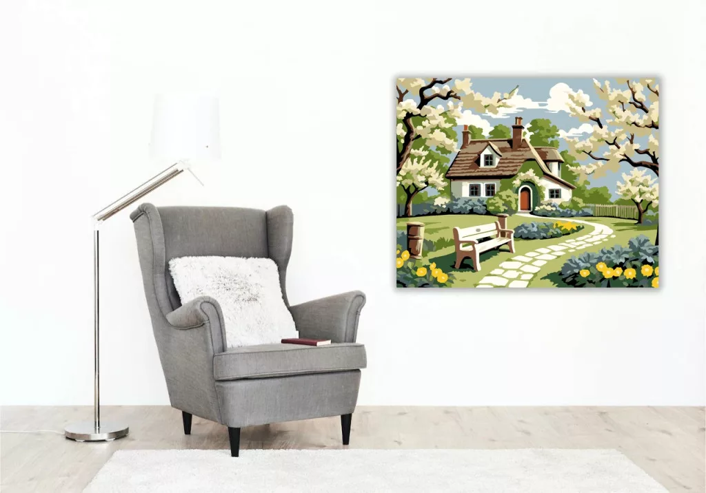 A képen egy békés vidéki házikó látható, amelyet virágzó gyümölcsfák vesznek körül. A kertben kanyargó kőösvény vezet a bejárathoz, az előtérben pedig egy pad hív pihenésre. A világos égbolt és a friss tavaszi növényzet nyugodt, derűs hangulatot ad a jelenetnek. Díszítsd otthonodat saját kézzel készített műalkotással, vagy ajándékozd meg szeretteidet egy igazán különleges élménnyel! A számfestő készletben minden szükséges eszköz megtalálható a festmény elkészítéséhez.