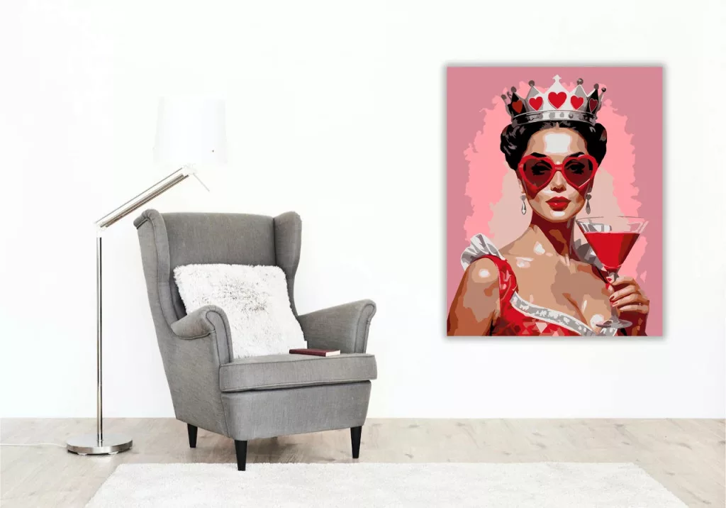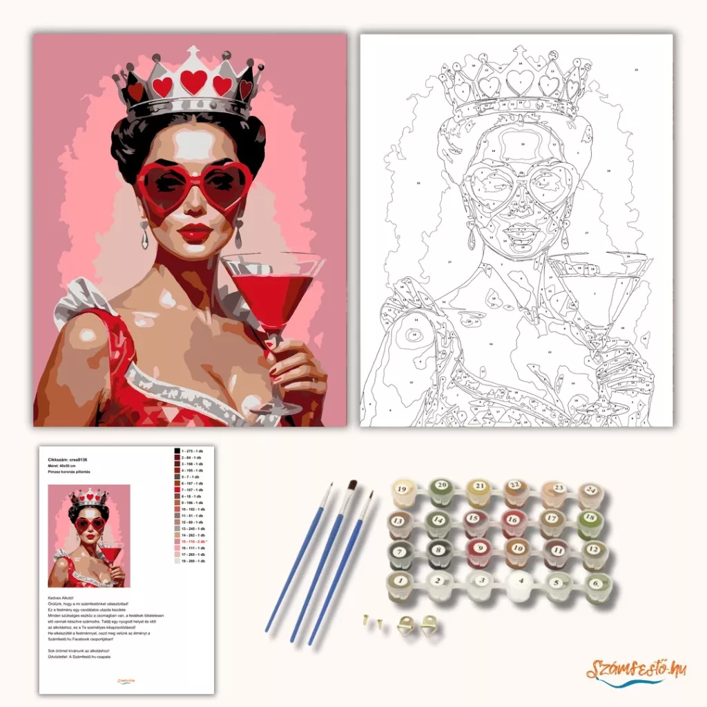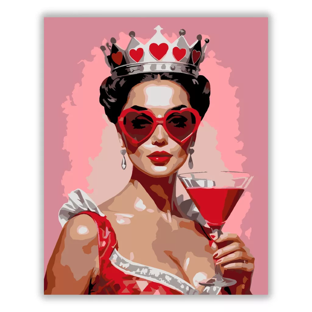 A képen egy női portré látható koronával és szív alakú napszemüveggel. A kezében egy koktélospoharat tart, miközben a háttér rózsaszín árnyalatokban ragyog. A piros részletek és a határozott formák elegáns, játékos hangulatot adnak a jelenetnek. Díszítsd otthonodat saját kézzel készített műalkotással, vagy ajándékozd meg szeretteidet egy igazán különleges élménnyel! A számfestő készletben minden szükséges eszköz megtalálható a festmény elkészítéséhez.