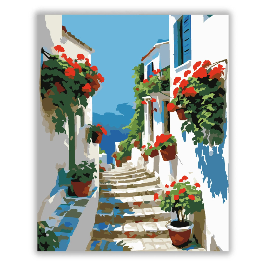 A képen egy keskeny, felfelé kanyargó lépcsős utca látható fehér házak között. Az erkélyeken és falakon sok virágcserép van, élénk piros virágokkal és zöld levelekkel. A távolban a tenger és a tiszta ég ad nyugodt, napfényes hangulatot. Varázsolj egyedi hangulatot otthonodba ezzel a gyönyörű számfestő készlettel, amely tökéletes ajándék is lehet szeretteid számára. A csomag mindent tartalmaz, amire szükséged van ahhoz, hogy saját kezűleg alkoss egy lenyűgöző festményt.