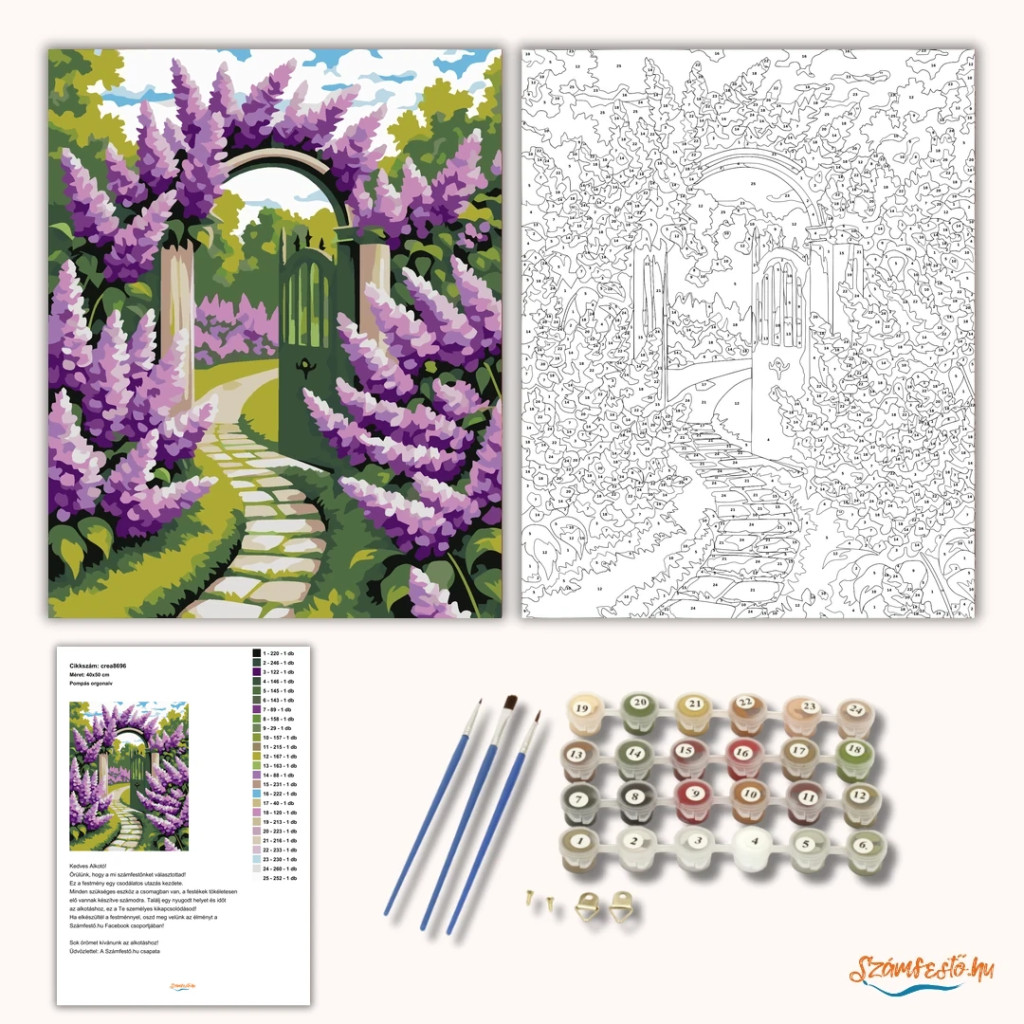 A képen egy kerti kapu és boltíves bejárat látható, amelyet teljes virágzásban lévő orgonabokrok vesznek körül. A kanyargó kerti ösvény a zöld lombok közé vezet, nyugodt, tavaszi hangulatot teremtve. A lila és zöld árnyalatok friss, romantikus kertélményt adnak. Legyen a lakásod dísze vagy egy kedves meglepetés valaki számára – ez a számfestő készlet tökéletes választás mindkettőre. A készletben mindent megtalálsz, amivel lépésről lépésre megalkotható ez a gyönyörű festmény.
