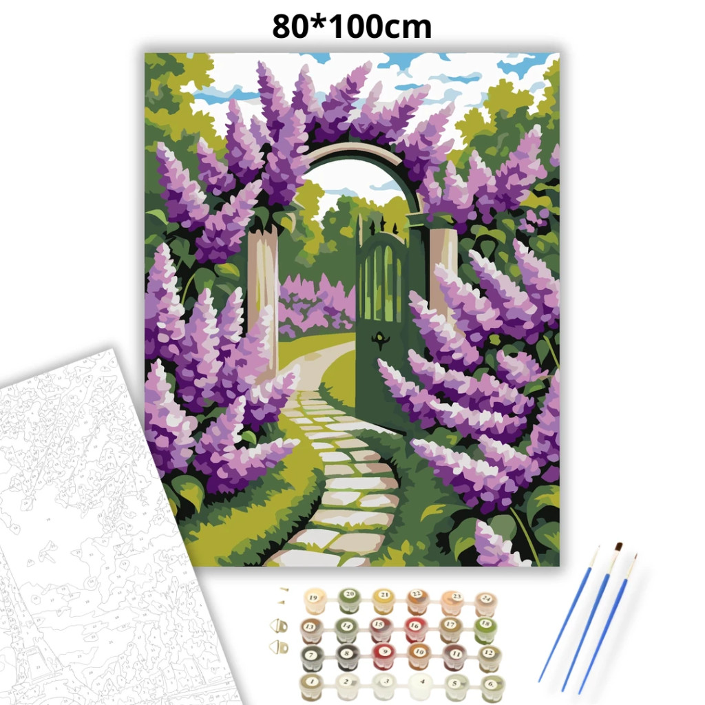 A képen egy kerti kapu és boltíves bejárat látható, amelyet teljes virágzásban lévő orgonabokrok vesznek körül. A kanyargó kerti ösvény a zöld lombok közé vezet, nyugodt, tavaszi hangulatot teremtve. A lila és zöld árnyalatok friss, romantikus kertélményt adnak. Engedd szabadjára a kreativitásodat, és alkoss egy különleges műalkotást, amely otthonod dísze lehet de egyedi ajándékként is kiváló. A számfestő készletben minden szükséges eszközt megtalálsz a tökéletes végeredményhez.