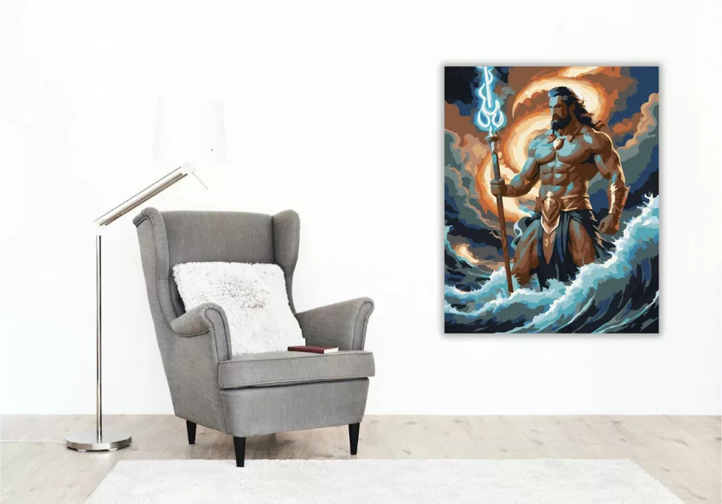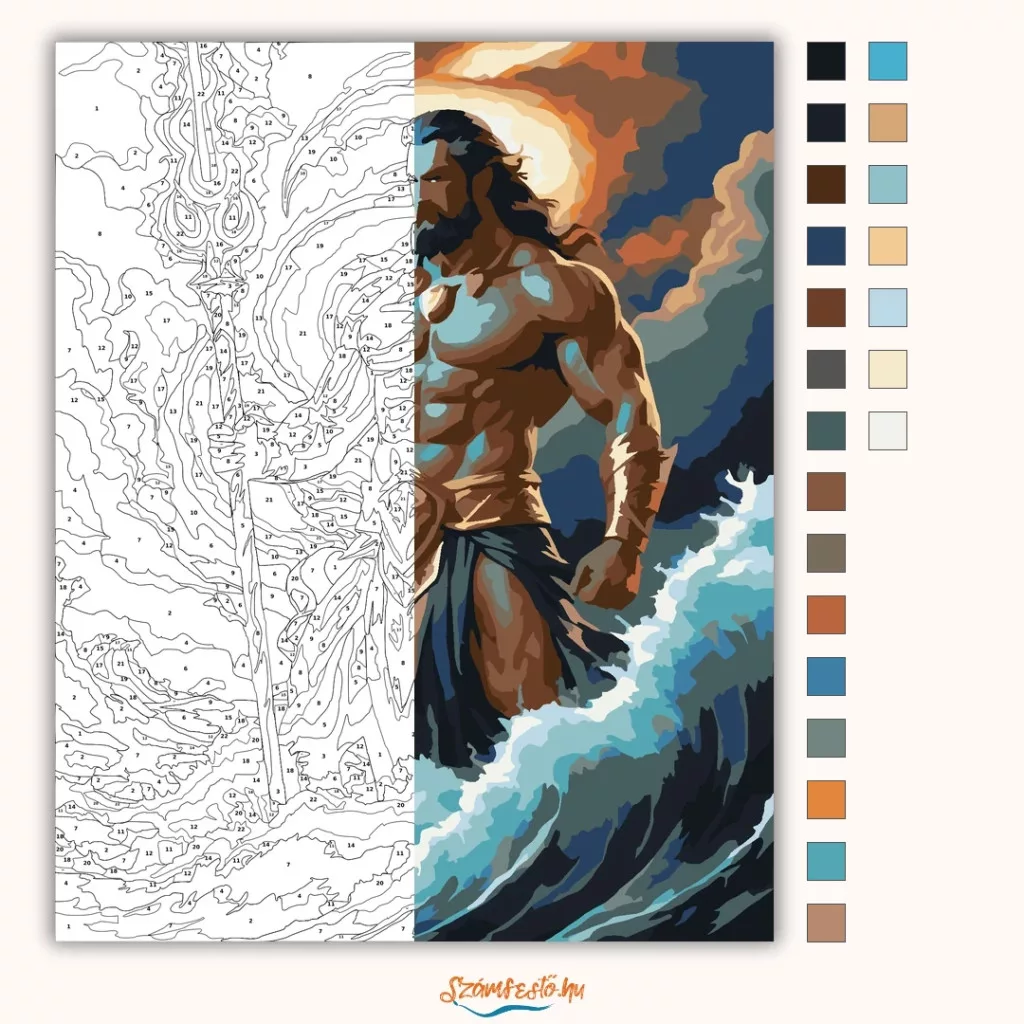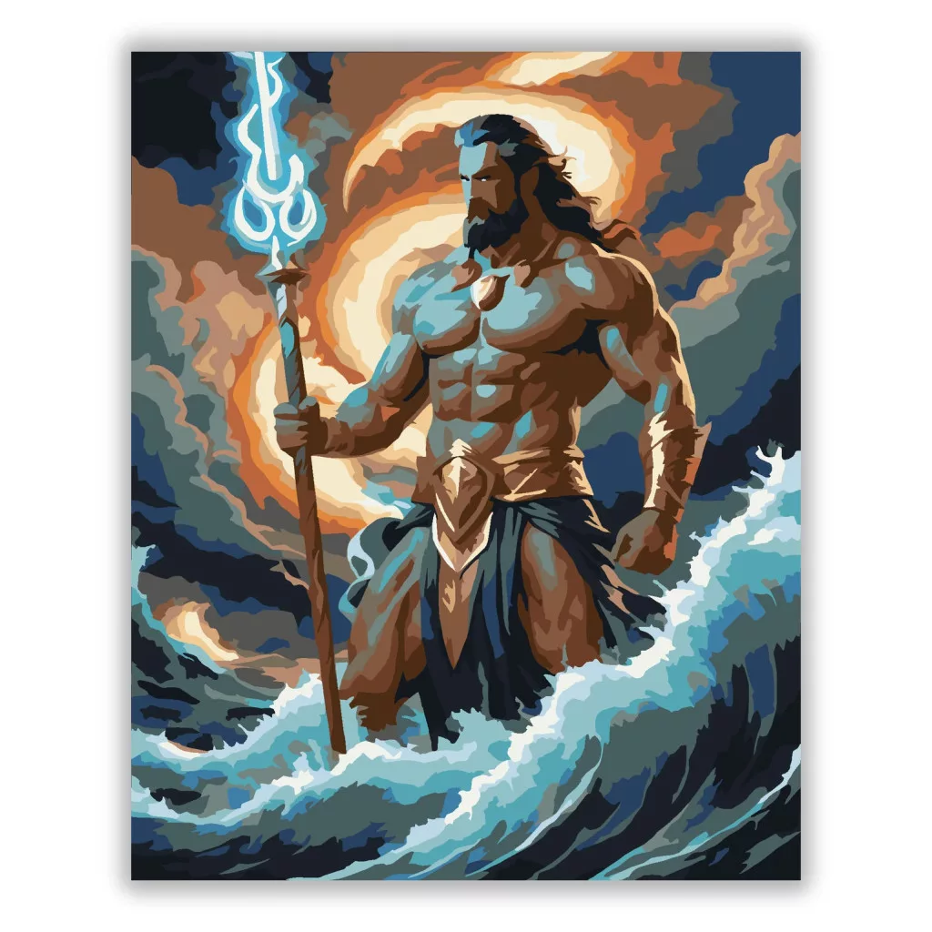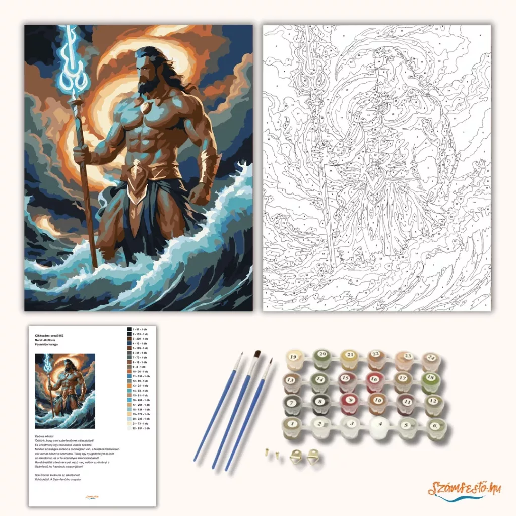 A képen Poszeidón emelkedik ki a viharos hullámokból, magasra tartott háromágú szigonnyal. Mögötte sötét, kavargó felhők és villámlással megvilágított ég látható. A jelenet erőt és drámai tengeri hangulatot áraszt, a mély kékek és a fénylő, meleg felhőtónusok kontrasztjával. Engedd szabadjára a kreativitásodat, és alkoss egy különleges műalkotást, amely otthonod dísze lehet de egyedi ajándékként is kiváló. A számfestő készletben minden szükséges eszközt megtalálsz a tökéletes végeredményhez.