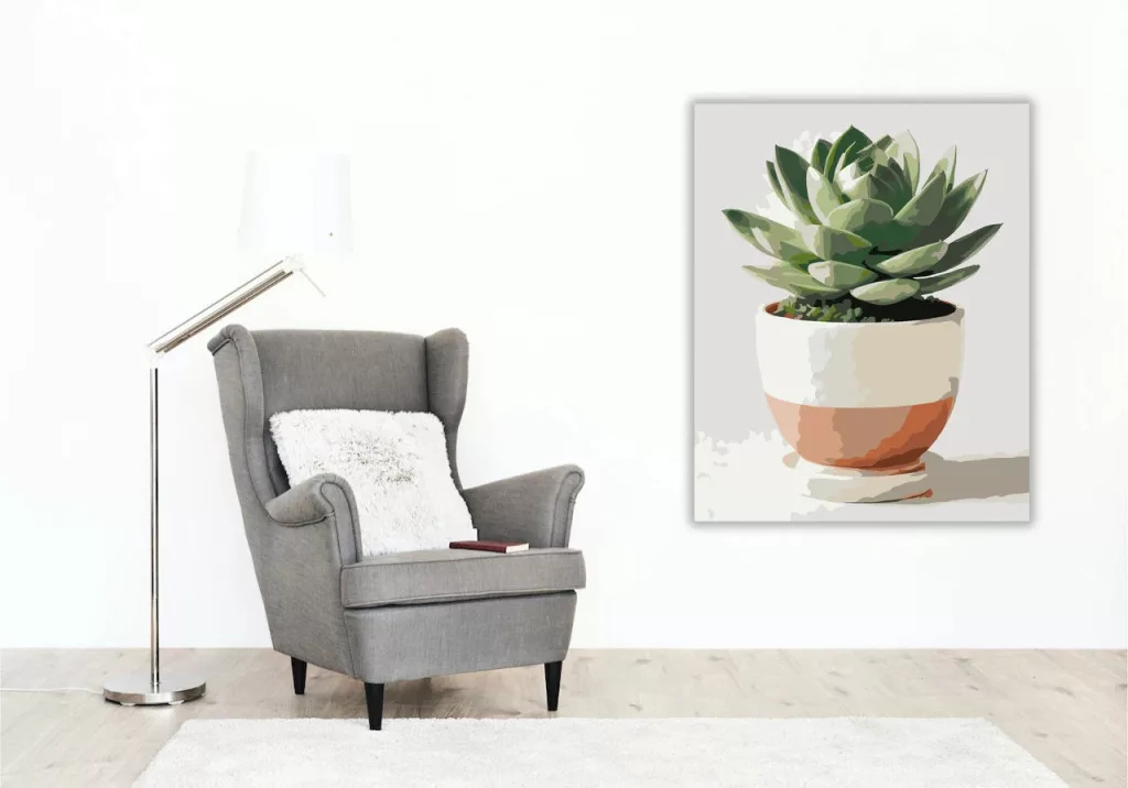 A képen egy pozsgás növény látható egy krémszínű kerámia cserépben, fehér háttér előtt. A húsos levelek rétegesen nyílnak szét, friss, nyugodt hangulatot adva. Letisztult, világos látvány, ami jól illik modern otthoni vagy irodai környezetbe. Legyen a lakásod dísze vagy egy kedves meglepetés valaki számára – ez a számfestő készlet tökéletes választás mindkettőre. A készletben mindent megtalálsz, amivel lépésről lépésre megalkotható ez a gyönyörű festmény.