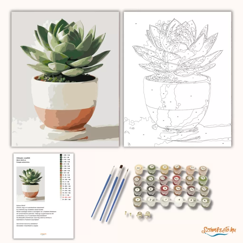 A képen egy pozsgás növény látható egy krémszínű kerámia cserépben, fehér háttér előtt. A húsos levelek rétegesen nyílnak szét, friss, nyugodt hangulatot adva. Letisztult, világos látvány, ami jól illik modern otthoni vagy irodai környezetbe. Ez a számfestő készlet tökéletes választás, ha egyedi dekorációval tennéd szebbé otthonodat, vagy ha különleges ajándékot keresel. A csomagban minden megtalálható, amire a festéshez szükséged van.