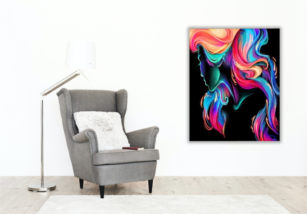 absztrakt haj, női portré, sziluett, szivárvány haj