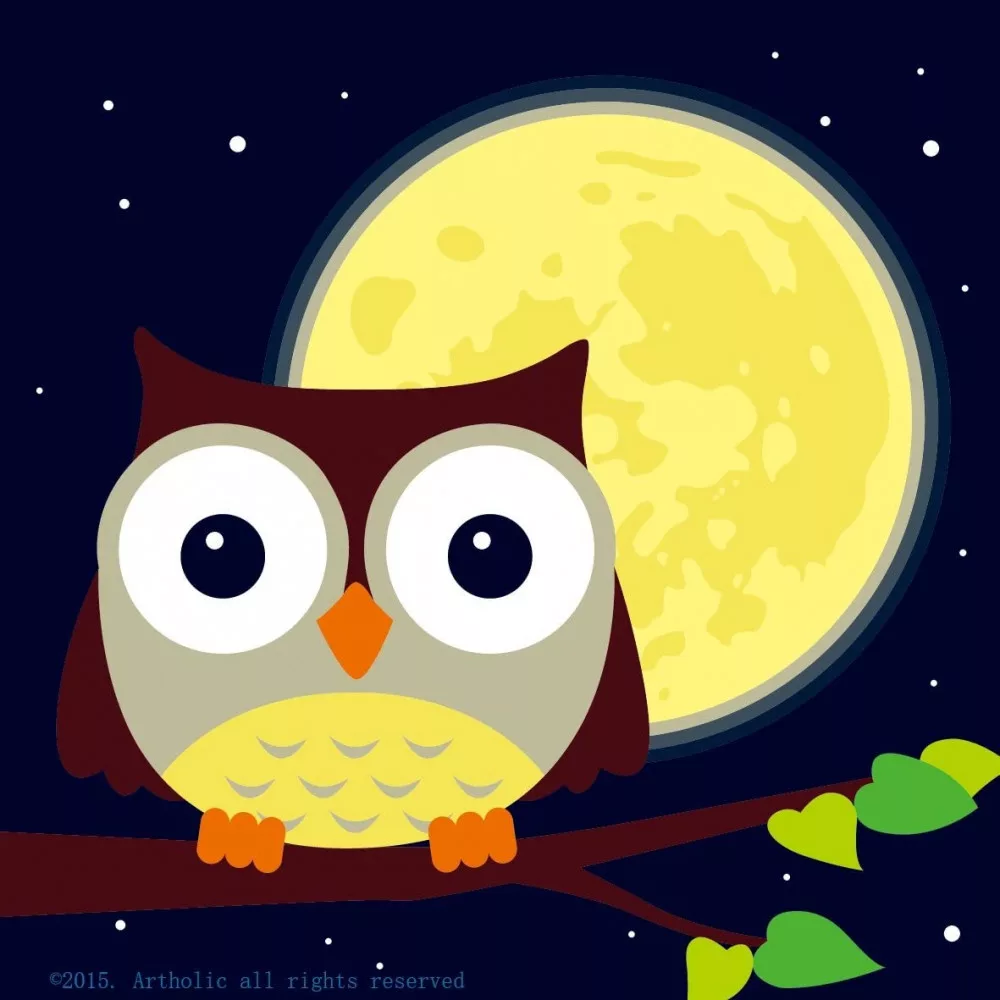 Ez a kép egy barátságos kis bagolyka, aki a csillagos égen ül egy ágon, miközben a telihold ragyog felette. A sötétkék és sárga színek varázslatos éjszakai hangulatot teremtenek. Tökéletes választás a gyerekek első festős kalandjához!