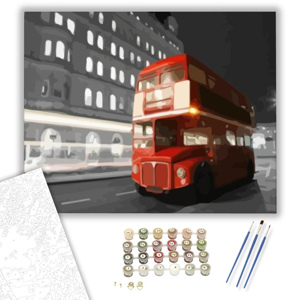 A kép nyüzsgő városi éjszakát idéz meg, ahol a piros emeletes busz magával ragadó nosztalgiát kelt. A háttérben sejtelmesen megjelenő épületek történeteket mesélnek egy sosem alvó városról. A kontrasztos színek és árnyalatok dinamikát visznek a kompozícióba, életre keltve az éjszakai fények játékát. Ideális választás modern nappalikba vagy irodákba, ahol a városi élet vibrálása inspirálhat. A készlet tartalmaz minden szükséges eszközt, hogy életre keltsd ezt az ikonikus jelenetet.