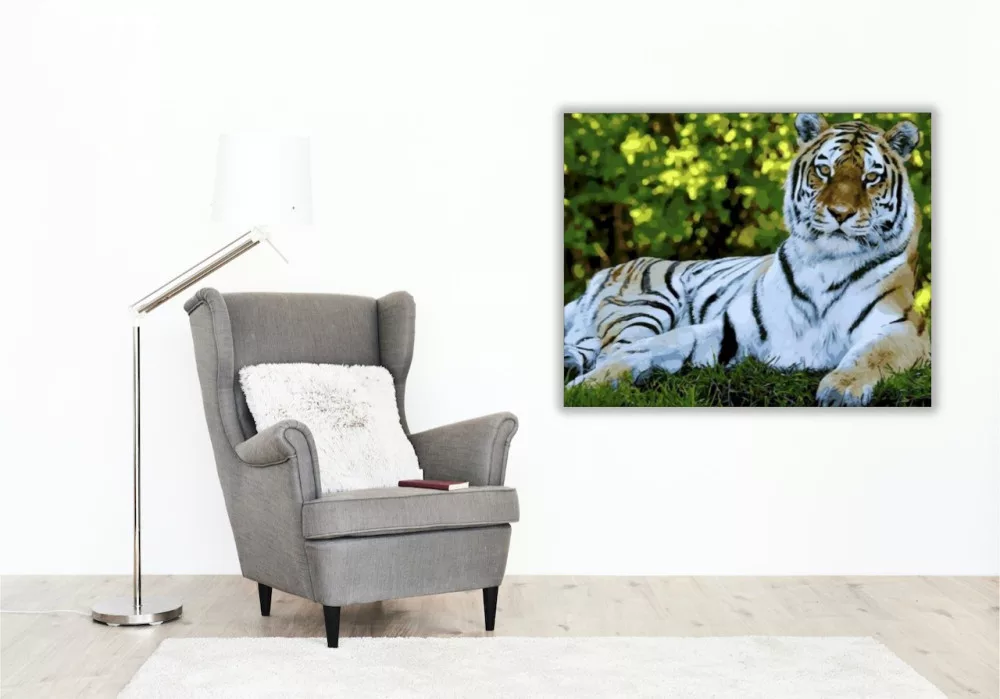 A festmény egy nyugodt, mégis erőt sugárzó jelenetet ábrázol, amely azonnal magával ragadja a nézőt. A tigris tekintetéből áradó bölcsesség és nyugalom egy titokzatos történetet mesél el. A zöld háttér harmonikus kontrasztot alkot a tigris csíkos bundájával, erősítve a kompozíció erejét. Ideális választás nappaliba vagy dolgozószobába, ahol inspiráló környezetet teremthet. A készlet tartalmazza a szükséges eszközöket, hogy mindenki saját műalkotását hozhassa létre.