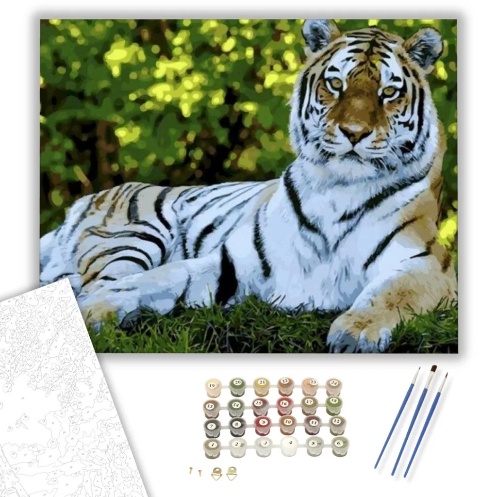 A festmény egy nyugodt, mégis erőt sugárzó jelenetet ábrázol, amely azonnal magával ragadja a nézőt. A tigris tekintetéből áradó bölcsesség és nyugalom egy titokzatos történetet mesél el. A zöld háttér harmonikus kontrasztot alkot a tigris csíkos bundájával, erősítve a kompozíció erejét. Ideális választás nappaliba vagy dolgozószobába, ahol inspiráló környezetet teremthet. A készlet tartalmazza a szükséges eszközöket, hogy mindenki saját műalkotását hozhassa létre.