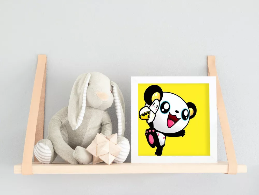 Ez a kép egy vidám kis pandát ábrázol, aki boldogan integet egy banánnal a kezében. A sárga háttér és a cuki panda mosolya garantáltan mosolyt csal mindenki arcára. Tökéletes választás a gyerekek első kreatív kalandjához!