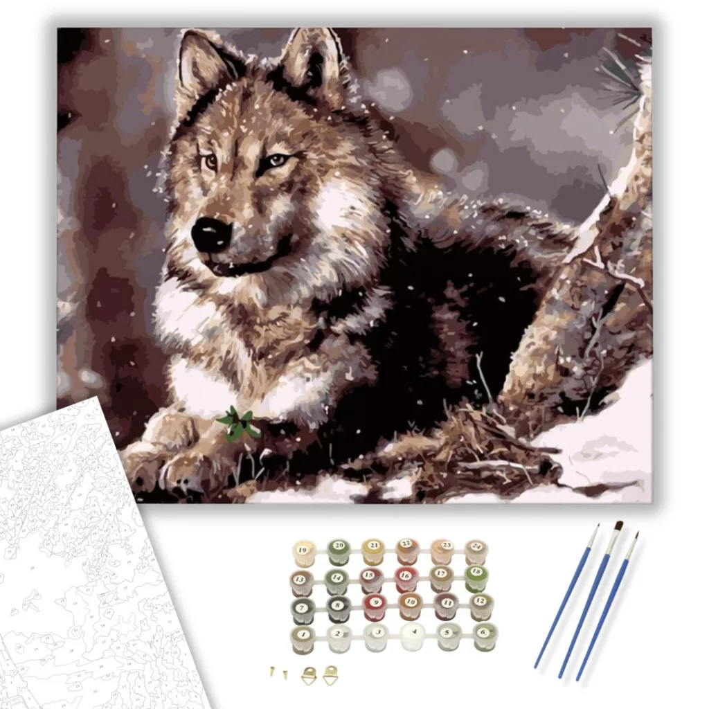 A havas tájban pihenő farkas nyugalmat és erőt sugároz. Az állat tekintete mintha egy titokzatos történetet mesélne el a vadonból. A kép árnyalatai a természet színeit idézik, fokozva a kompozíció harmóniáját. Ideális választás nappaliba vagy dolgozószobába, ahol a természet közelségét szeretnénk érezni. A készlet tartalmaz minden szükséges eszközt az alkotáshoz, hogy otthonodba varázsolhasd a vadon szépségét.