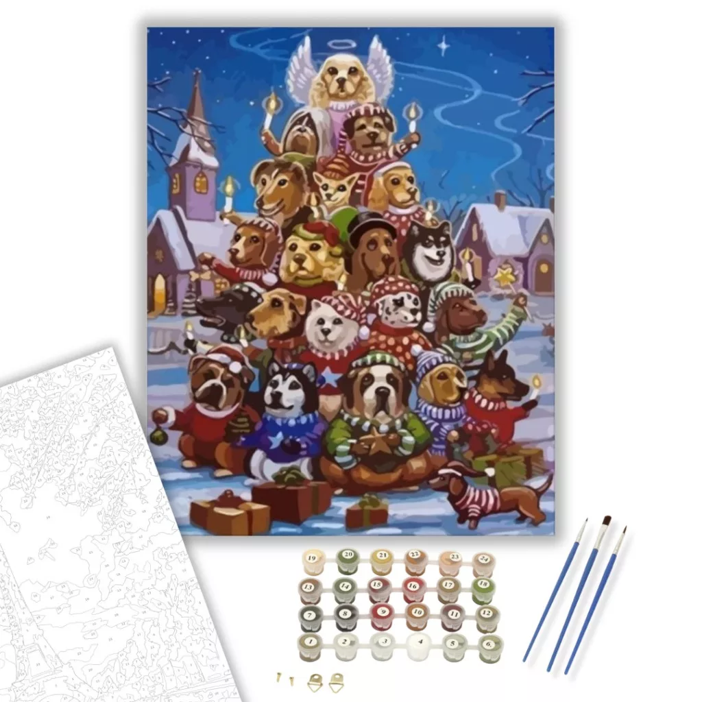 A kép varázslatos karácsonyi hangulatot áraszt, amely mosolyt csal az arcokra. A kutyusokból álló karácsonyfa életre kelti a szeretet és összetartozás meséjét. A háttérben csillogó hó és meleg fények fokozzák a kompozíció ünnepi báját. Ideális választás nappaliba vagy gyerekszobába, ahol szívmelengető látványt nyújt. A készlet minden szükséges eszközt tartalmaz a kreatív kalandhoz, hogy saját kezűleg kelthesd életre ezt a bájos jelenetet.