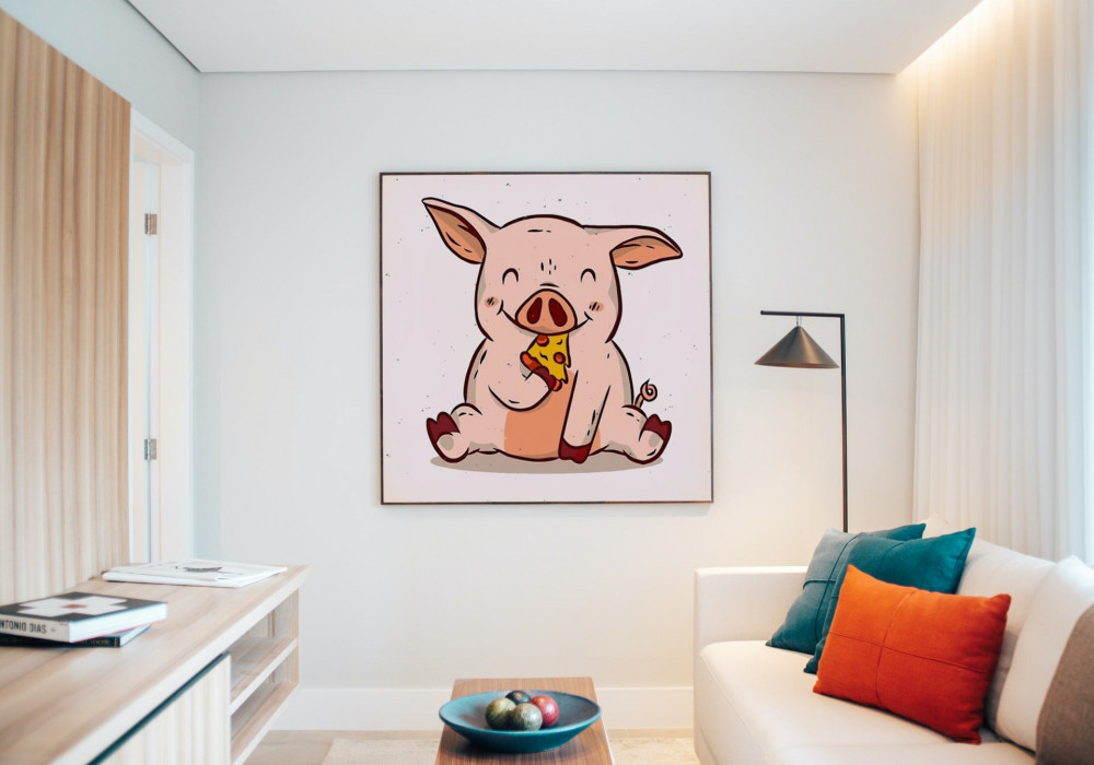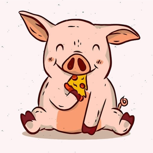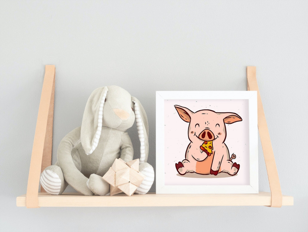 Ez a kép egy vidám kis malacot ábrázol, aki éppen egy szelet pizzát majszol boldogan. A barátságos rózsaszín és sárga színek mókás hangulatot teremtenek. Tökéletes választás a gyerekek első színes kalandjához!