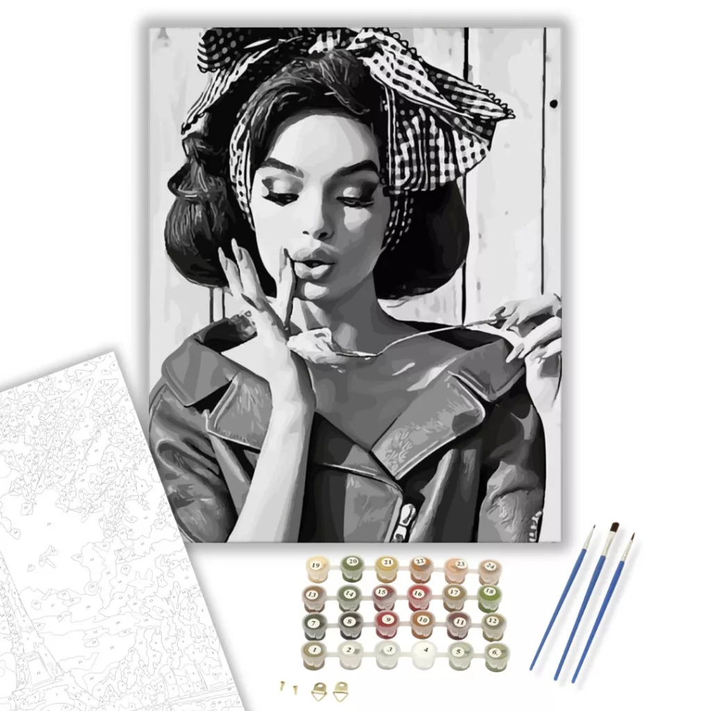 Ez a festmény egy időtlen eleganciát sugárzó pillanatot örökít meg, amely nosztalgikus hangulatot kelt a nézőben. A kép mögött megbújik egy történet a múltból, tele rejtéllyel és stílussal. A fekete-fehér színek kontrasztja kiemeli a részleteket, és különleges atmoszférát teremt. Tökéletes választás lehet egy elegáns nappaliba vagy egy stílusos hálószobába. A csomag tartalmazza az összes szükséges eszközt, hogy életre kelthesd ezt a varázslatos képet.