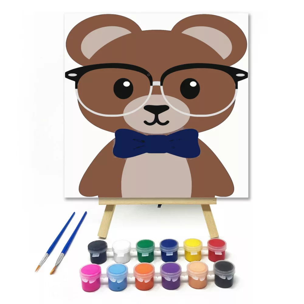 Ez a kép egy cuki mackót ábrázol, aki szemüvegben és csokornyakkendőben mosolyog rád. A barátságos barna és kék színek vidám hangulatot árasztanak. Tökéletes választás a gyerekek első kreatív kalandjához!