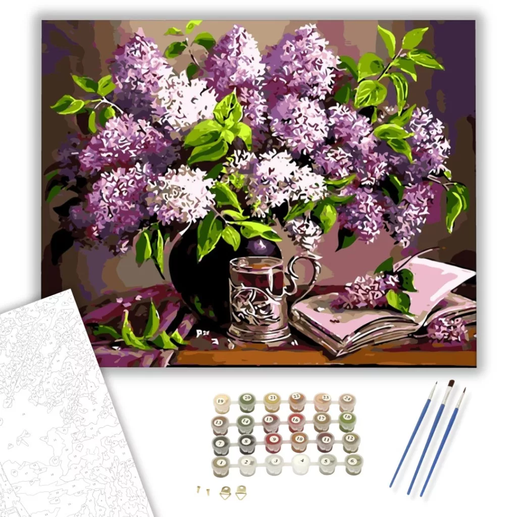 Ez a festmény nyugalmat és eleganciát áraszt, mintha egy csendes tavaszi délutánon sétálnánk. A képen megelevenedő történet magával ragadja a nézőt, ahogy a virágok életre kelnek. A lila és zöld árnyalatok harmóniája frissességet kölcsönöz a kompozíciónak. Ideális választás nappaliba vagy olvasósarokba, ahol az otthonosságot fokozza. A készlet mindent tartalmaz, ami szükséges egy lenyűgöző műalkotáshoz.