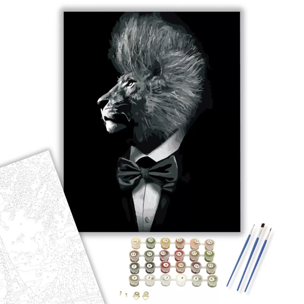 Ez a festmény elegáns és misztikus hangulatot áraszt, amely magával ragadja a nézőt. Egy különleges történetet mesél el egy oroszlánról, aki emberi alakban jelenik meg. A fekete háttér kiemeli az oroszlán királyi megjelenését és a színek kontrasztját. Ideális választás lehet egy modern nappaliba vagy dolgozószobába, ahol eleganciát és karaktert szeretnénk sugározni. A készlet tartalmazza az összes szükséges eszközt, hogy életre kelthesd ezt a lenyűgöző képet.