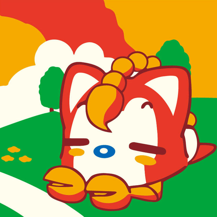Ez a kép egy aranyos kis rókát ábrázol, aki békésen szundikál egy színes mezőn. A vidám piros, narancs és zöld színek melegséget sugároznak, és megnyugtató hangulatot árasztanak. Tökéletes választás a gyerekek kreatív pihenéséhez!