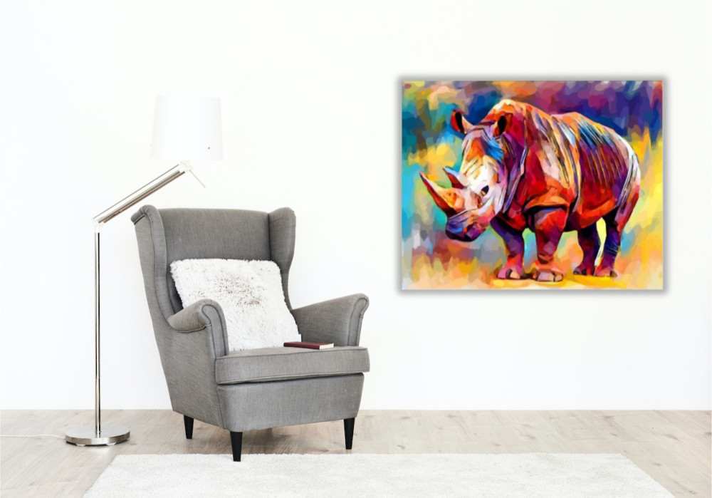 Ez a vibráló festmény azonnal magával ragadja a nézőt, mintha egy színes álomvilágba lépne be. Az orrszarvú alakjának erőteljes vonalai egy titokzatos történetet mesélnek el, amely csak arra vár, hogy felfedezzük. A háttér színkavalkádja dinamikát és mélységet kölcsönöz a kompozíciónak, mintha az állat éppen egy kaleidoszkópikus tájon haladna keresztül. Tökéletes választás lehet egy modern nappaliba vagy kreatív sarokba, ahol inspirációt keresünk. A készlet mindent tartalmaz, ami szükséges ahhoz, hogy saját kezűleg életre keltsd ezt a műalkotást.