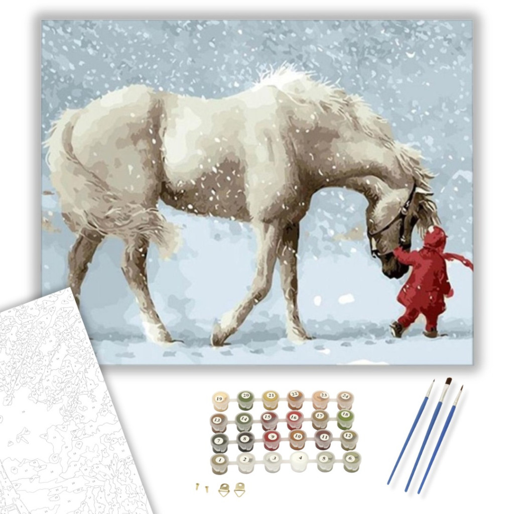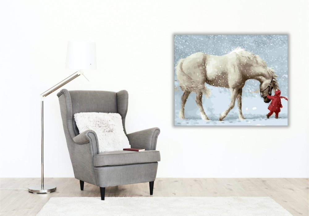 A festmény egy meghitt, téli pillanatot örökít meg, ahol a hóesés békés csendje öleli körül a tájat. Egy gyermeki kíváncsiság találkozik az állatok iránti szeretettel, ahogy egy kisgyermek és egy ló közt szövődik különleges kapcsolat. A hideg kék és fehér árnyalatok megnyugtató hátteret adnak a jelenetnek, míg a piros ruházat melegséget visz a kompozícióba. Ideális választás nappalik vagy gyerekszobák dekorálásához, ahol a szeretet és az ártatlanság kap helyet. A készlet mindent tartalmaz, amire szükséged van ahhoz, hogy ezt a varázslatos jelenetet életre keltsd.