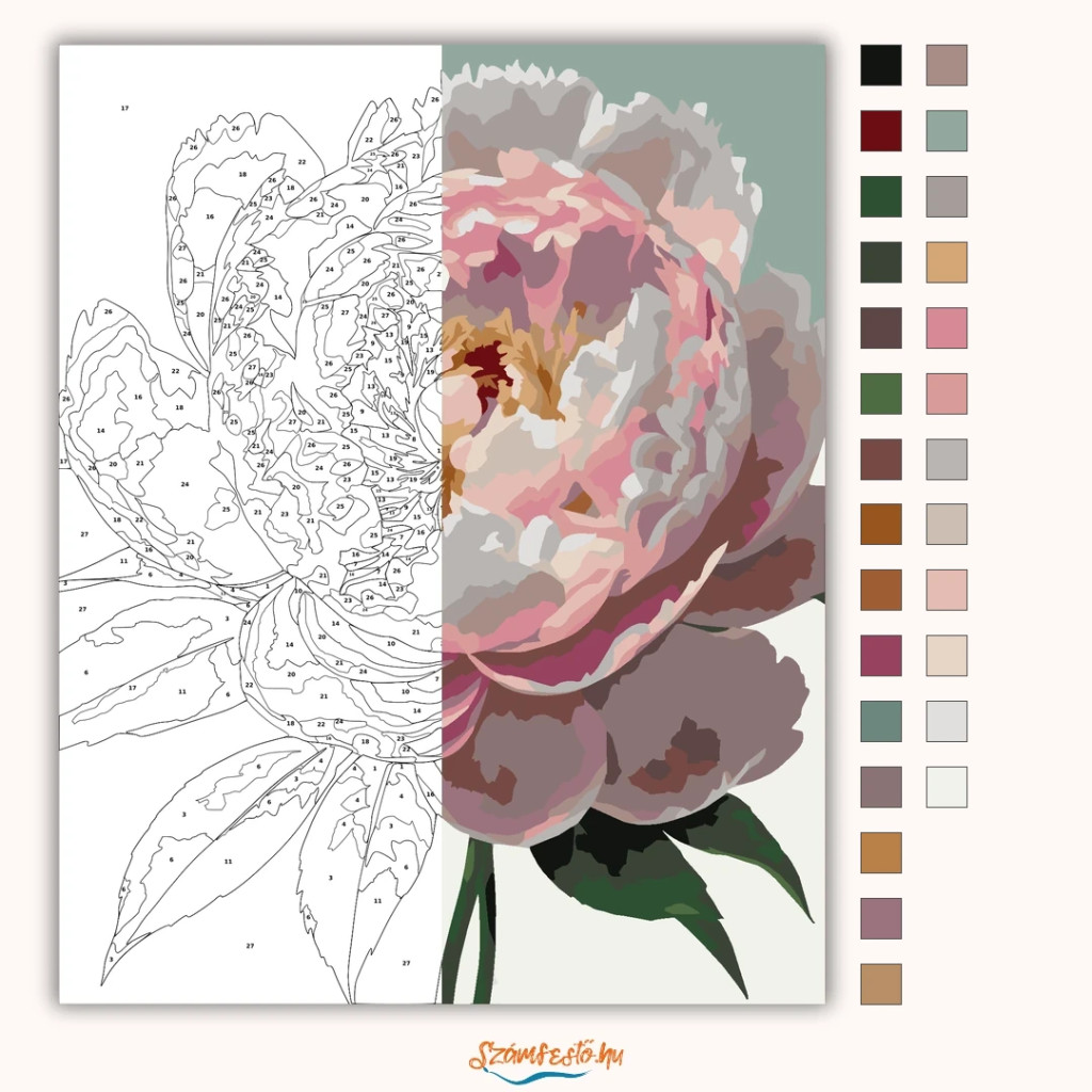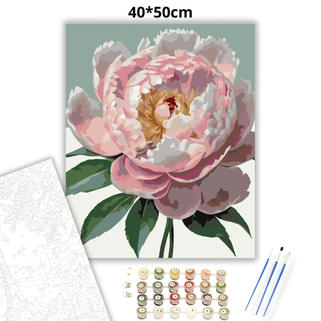 A képen egy nagy, nyíló pünkösdi rózsa látható, réteges szirmokkal és puha zöld levelekkel. A virág középpontja részletgazdag, a szirmok finom, pasztelles árnyalatokban váltakoznak. Letisztult háttéren igazán elegáns, nyugodt hangulatú dísz lehet bármelyik szobában. Engedd szabadjára a kreativitásodat, és alkoss egy különleges műalkotást, amely otthonod dísze lehet de egyedi ajándékként is kiváló. A számfestő készletben minden szükséges eszközt megtalálsz a tökéletes végeredményhez.