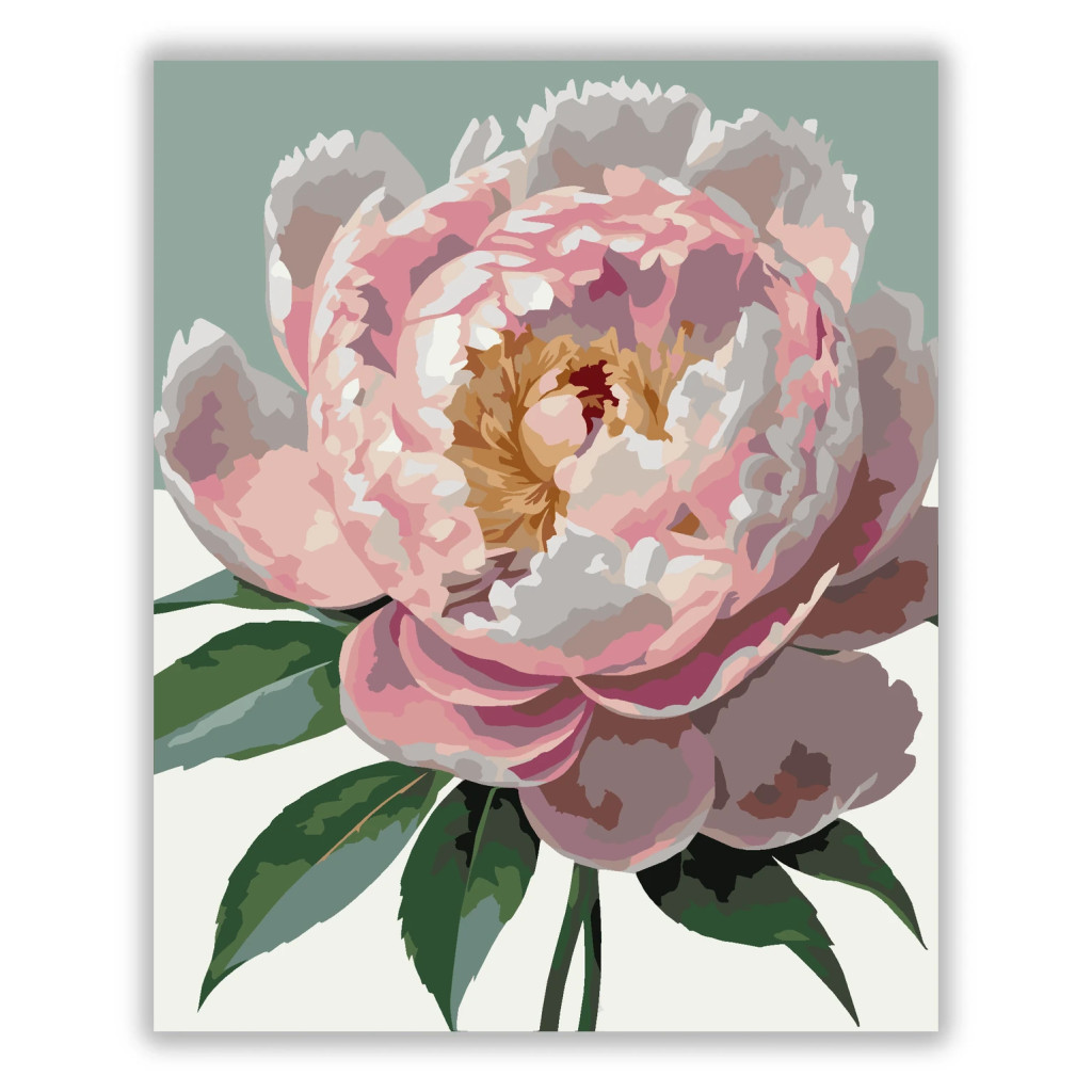 A képen egy nagy, nyíló pünkösdi rózsa látható, réteges szirmokkal és puha zöld levelekkel. A virág középpontja részletgazdag, a szirmok finom, pasztelles árnyalatokban váltakoznak. Letisztult háttéren igazán elegáns, nyugodt hangulatú dísz lehet bármelyik szobában. Legyen a lakásod dísze vagy egy kedves meglepetés valaki számára – ez a számfestő készlet tökéletes választás mindkettőre. A készletben mindent megtalálsz, amivel lépésről lépésre megalkotható ez a gyönyörű festmény.