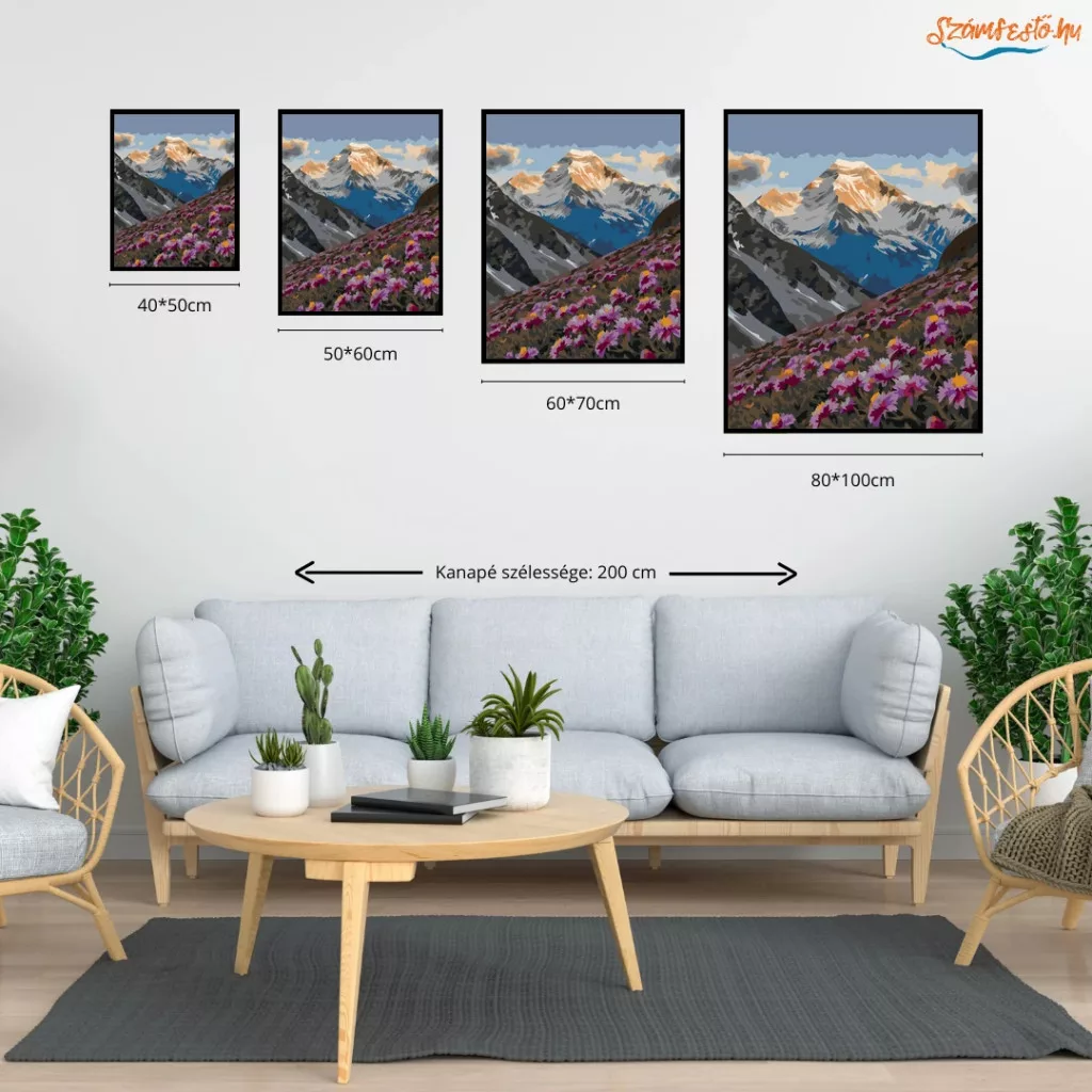 A képen a Mount Everest hófödte csúcsa látható a távolból, a hegyoldalakon sötét sziklák és gleccserfoltok váltakoznak. Az előtérben színes alpesi virágok borítják a lejtőt, ami friss, tavaszias hangulatot ad a látványnak. A felhős ég és a napfényben ragyogó hegycsúcs együtt igazán lélegzetelállító panorámát teremt. Legyen a lakásod dísze vagy egy kedves meglepetés valaki számára – ez a számfestő készlet tökéletes választás mindkettőre. A készletben mindent megtalálsz, amivel lépésről lépésre megalkotható ez a gyönyörű festmény.