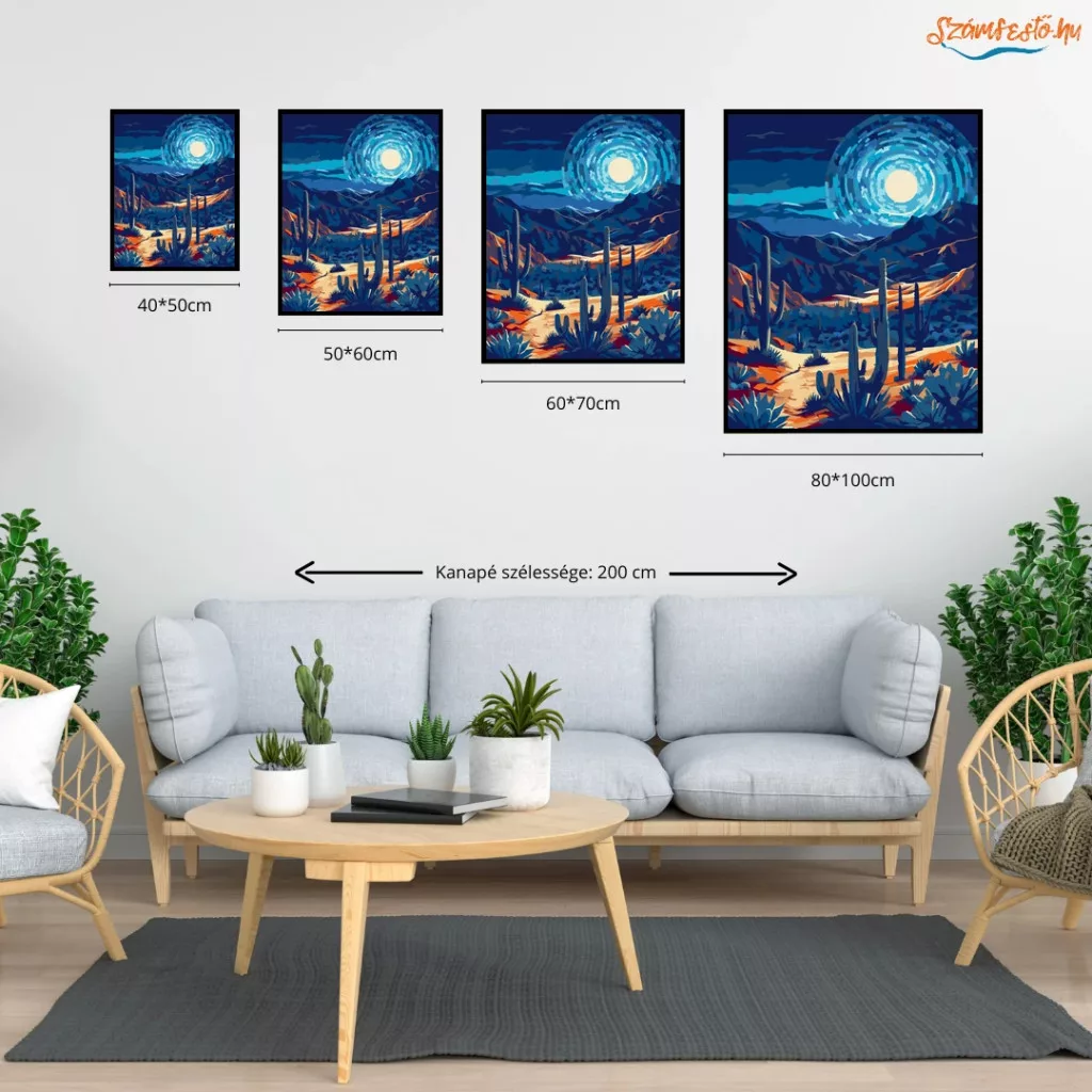 A képen egy sivatagi táj látható magas kaktuszokkal és bokrokkal, a háttérben sötét hegyvonulatokkal. Az éjszakai égbolton egy ragyogó, telihold-szerű fénykorong látszik, körülötte örvénylő fénygyűrűkkel. A mély kék árnyalatok és a meleg, homokos tónusok különleges, nyugodt hangulatot adnak a jelenetnek. Engedd szabadjára a kreativitásodat, és alkoss egy különleges műalkotást, amely otthonod dísze lehet de egyedi ajándékként is kiváló. A számfestő készletben minden szükséges eszközt megtalálsz a tökéletes végeredményhez.