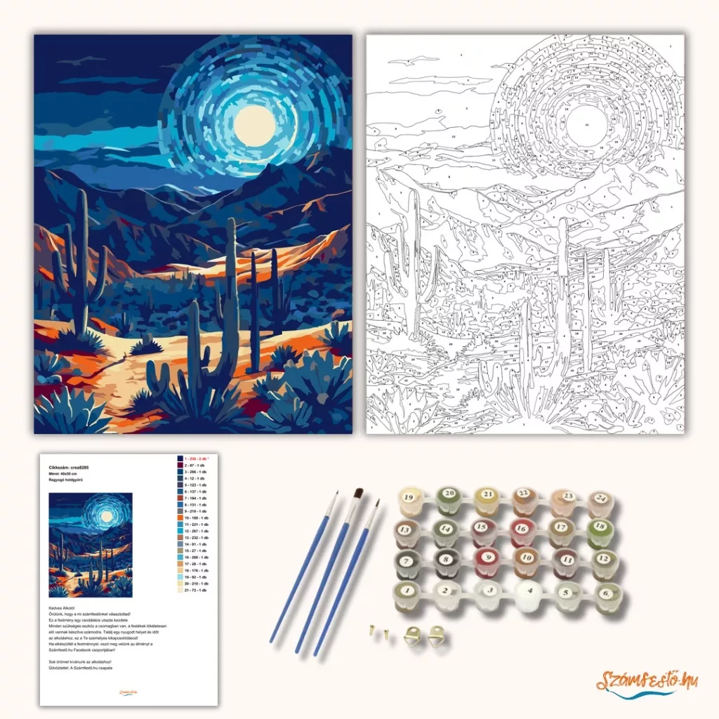 A képen egy sivatagi táj látható magas kaktuszokkal és bokrokkal, a háttérben sötét hegyvonulatokkal. Az éjszakai égbolton egy ragyogó, telihold-szerű fénykorong látszik, körülötte örvénylő fénygyűrűkkel. A mély kék árnyalatok és a meleg, homokos tónusok különleges, nyugodt hangulatot adnak a jelenetnek. Díszítsd otthonodat saját kézzel készített műalkotással, vagy ajándékozd meg szeretteidet egy igazán különleges élménnyel! A számfestő készletben minden szükséges eszköz megtalálható a festmény elkészítéséhez.