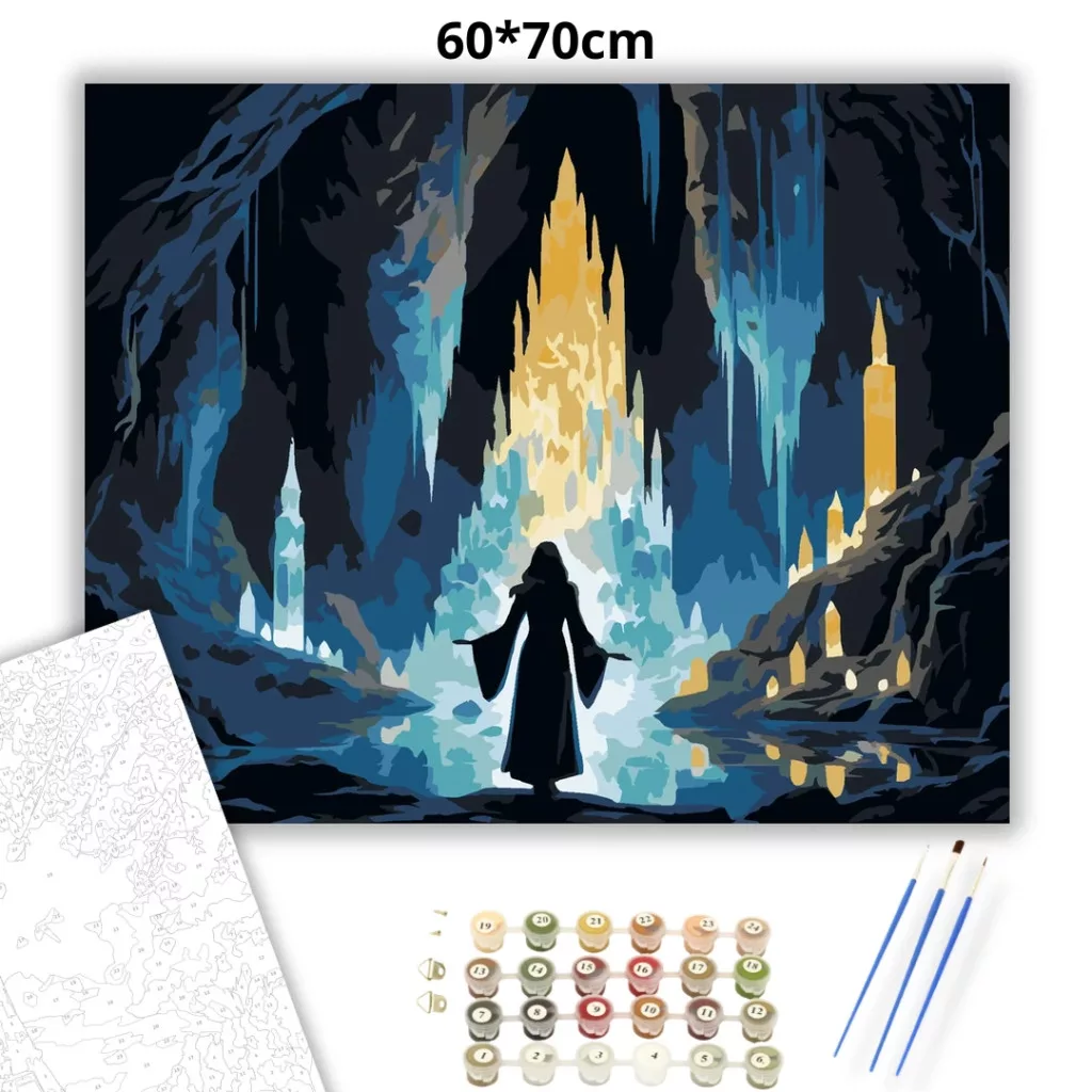 A képen egy kristálybarlang látható, ahol egy csuklyás alak áll a ragyogó kristályfalak előtt. A barlangot a lebegő fények és a kékes kristályok derengése tölti meg, középen egy aranyszínben izzó kristálytömbbel. Misztikus, varázslatos hangulatú jelenet, erős fény–árnyék hatással. Legyen a lakásod dísze vagy egy kedves meglepetés valaki számára – ez a számfestő készlet tökéletes választás mindkettőre. A készletben mindent megtalálsz, amivel lépésről lépésre megalkotható ez a gyönyörű festmény.