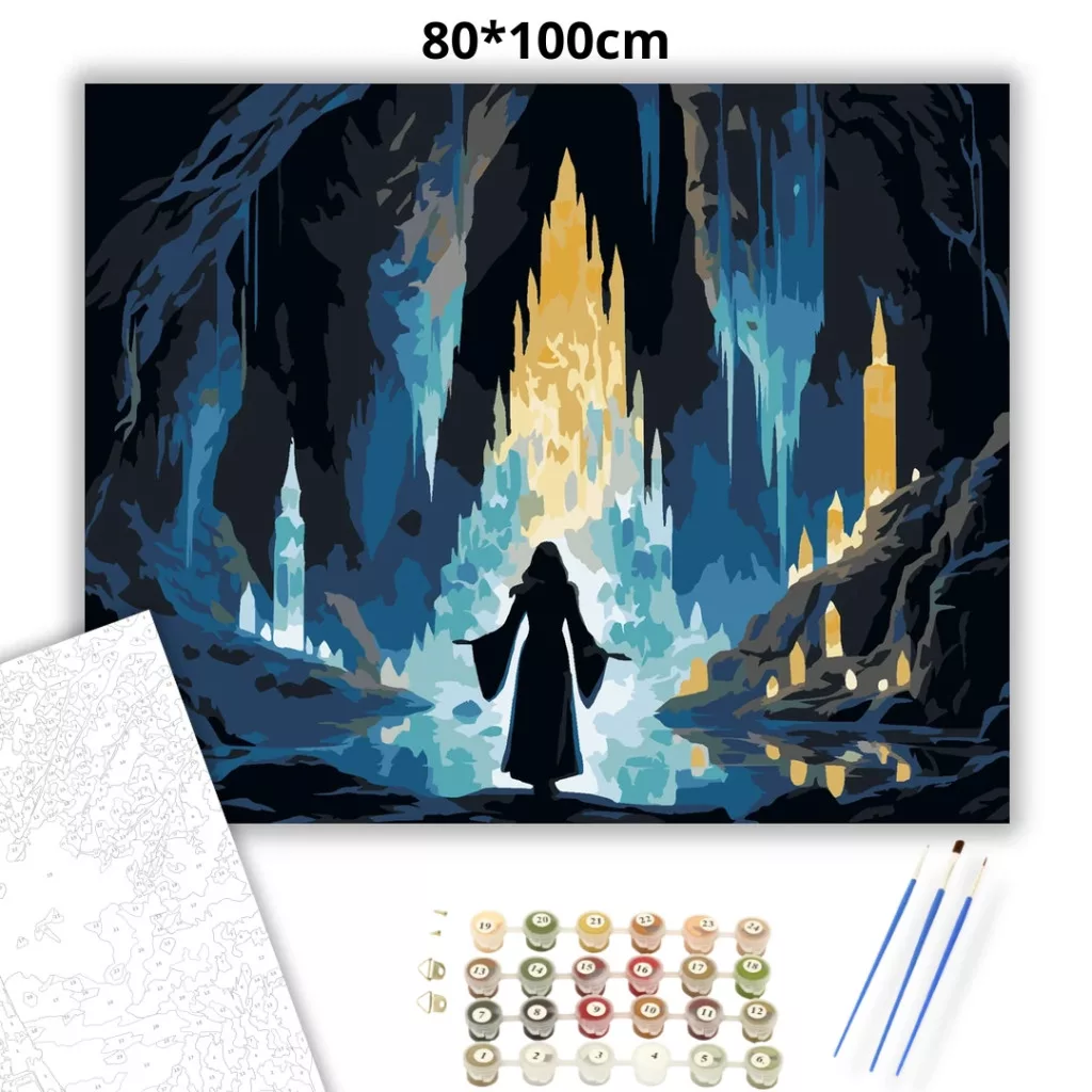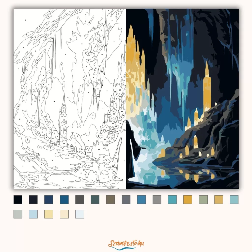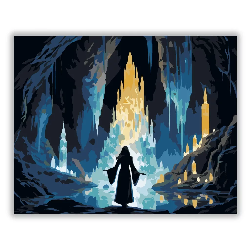 A képen egy kristálybarlang látható, ahol egy csuklyás alak áll a ragyogó kristályfalak előtt. A barlangot a lebegő fények és a kékes kristályok derengése tölti meg, középen egy aranyszínben izzó kristálytömbbel. Misztikus, varázslatos hangulatú jelenet, erős fény–árnyék hatással. Ez a számfestő készlet tökéletes választás, ha egyedi dekorációval tennéd szebbé otthonodat, vagy ha különleges ajándékot keresel. A csomagban minden megtalálható, amire a festéshez szükséged van.