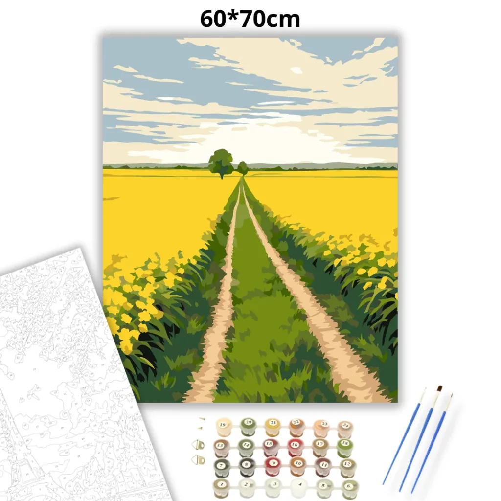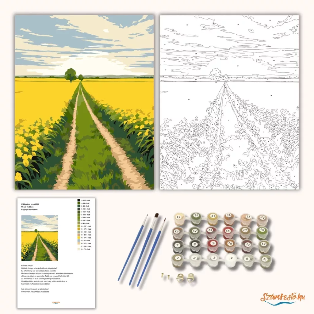 A képen egy hosszú földút vezet a távolba, két oldalán ragyogó repcemezőkkel. A horizonton néhány fa látszik, felettük tágas, felhős égbolt. Friss, tavaszi hangulatú tájkép, ami nyugalmat és szabadságérzetet ad. Varázsolj egyedi hangulatot otthonodba ezzel a gyönyörű számfestő készlettel, amely tökéletes ajándék is lehet szeretteid számára. A csomag mindent tartalmaz, amire szükséged van ahhoz, hogy saját kezűleg alkoss egy lenyűgöző festményt.