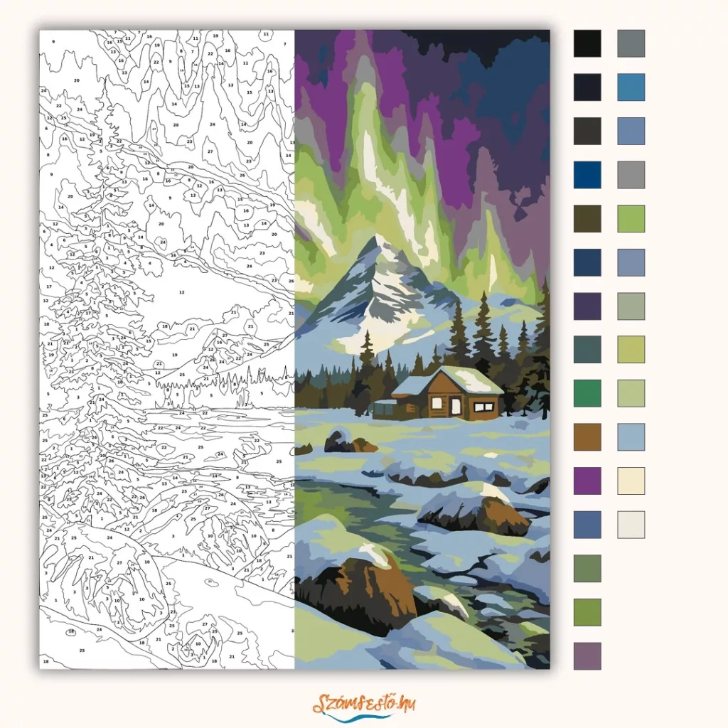 A képen egy havas, sarkvidéki táj látható hegycsúccsal, fenyőkkel és egy kis faházzal a hómező szélén. Elöl egy részben befagyott patak kanyarog a hóval borított sziklák között. Az égen zöldes fényfüggönyök hullámoznak, különleges, csendes téli hangulatot teremtve. Varázsolj egyedi hangulatot otthonodba ezzel a gyönyörű számfestő készlettel, amely tökéletes ajándék is lehet szeretteid számára. A csomag mindent tartalmaz, amire szükséged van ahhoz, hogy saját kezűleg alkoss egy lenyűgöző festményt.