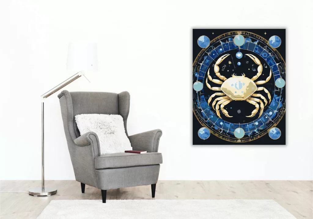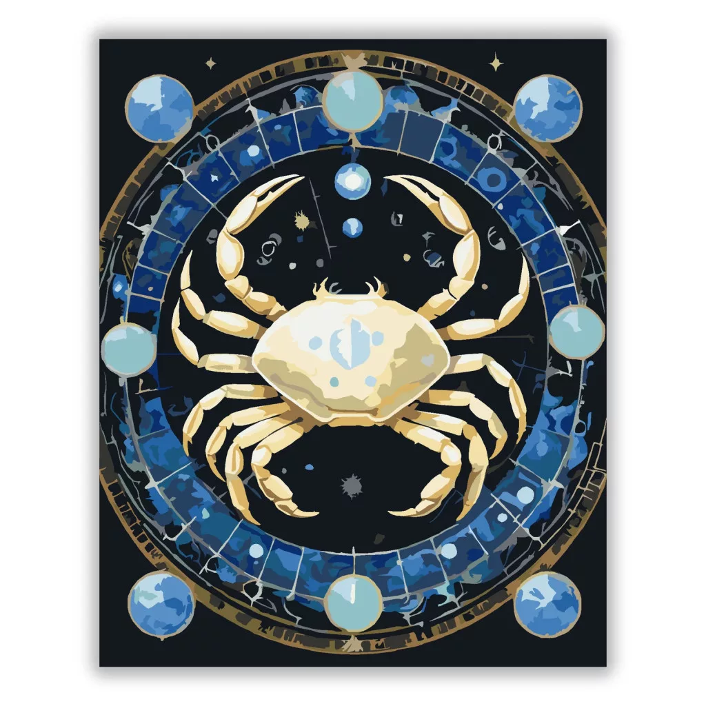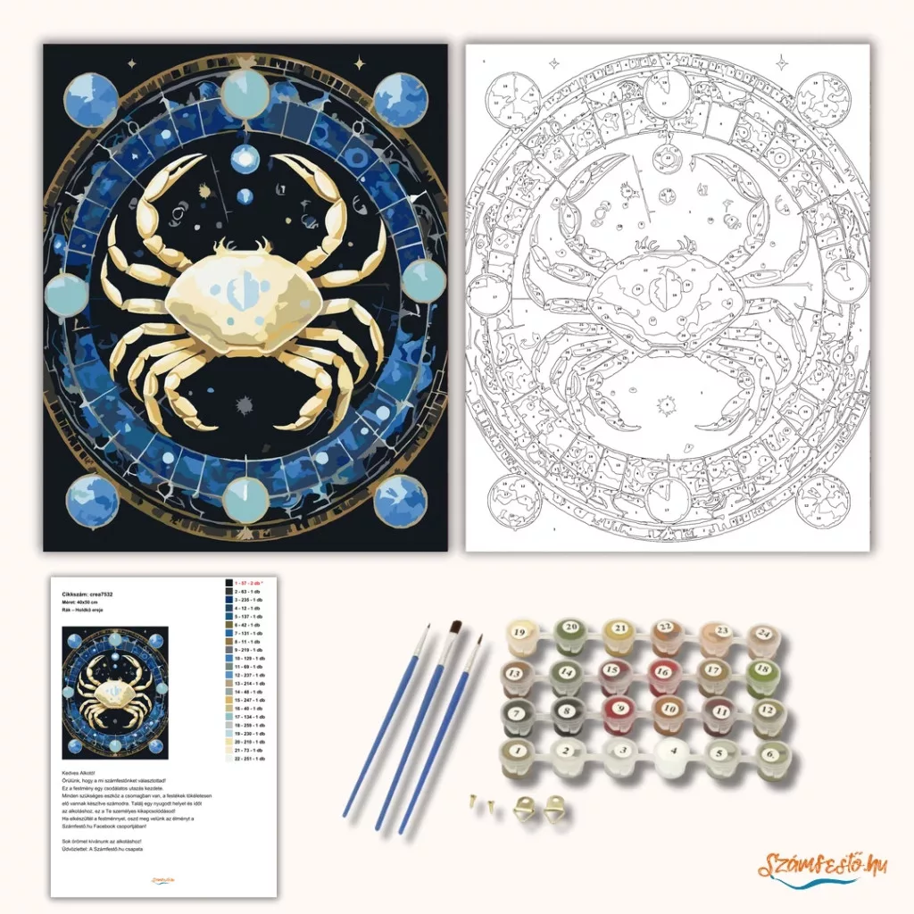 A képen egy rák látható a középpontban, világító, holdkőre emlékeztető páncéllal. Körülötte egy csillagképeket idéző kör és több fénylő gömb jelenik meg, éjszakai égbolt hangulattal. A sötét háttér és a kékes árnyalatok misztikus, nyugodt légkört teremtenek. Varázsolj egyedi hangulatot otthonodba ezzel a gyönyörű számfestő készlettel, amely tökéletes ajándék is lehet szeretteid számára. A csomag mindent tartalmaz, amire szükséged van ahhoz, hogy saját kezűleg alkoss egy lenyűgöző festményt.