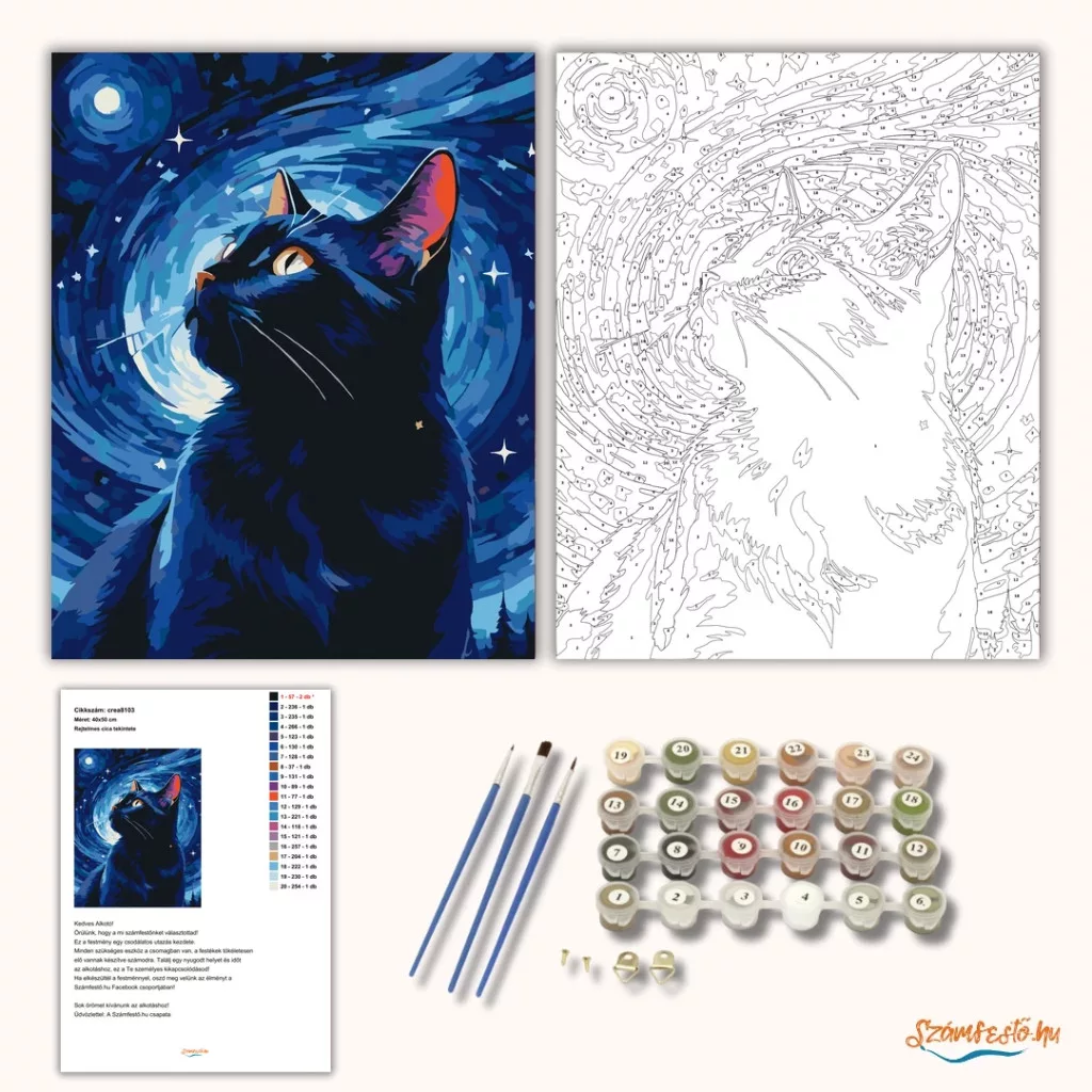 A képen egy fekete macska látható, ahogy felfelé néz az éjszakai ég felé. A háttérben örvénylő, csillagokkal teli égbolt és egy fényes hold jelenik meg. A mély kék árnyalatok és a ragyogó fények különleges, álomszerű hangulatot adnak. Engedd szabadjára a kreativitásodat, és alkoss egy különleges műalkotást, amely otthonod dísze lehet de egyedi ajándékként is kiváló. A számfestő készletben minden szükséges eszközt megtalálsz a tökéletes végeredményhez.