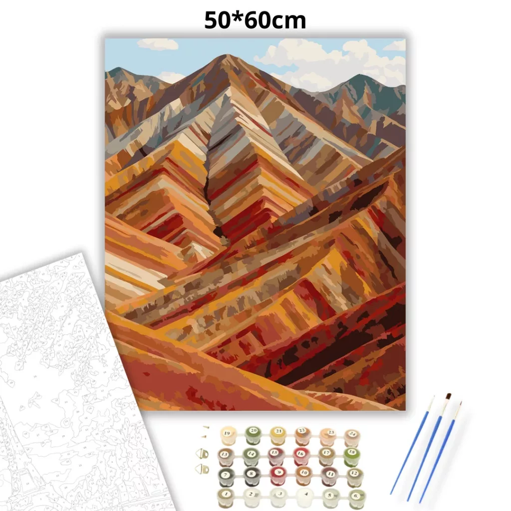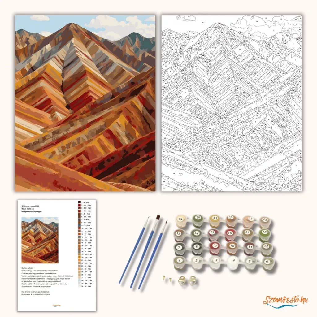 A képen a Zhangye szivárványhegyek réteges vonulatai láthatók, egymásra futó, hullámzó gerincekkel. A meleg földszínek és a világos sávok látványos, távoli tájhangulatot adnak. A háttérben magasabb hegycsúcsok és néhány felhő teszi teljessé a panorámát. Díszítsd otthonodat saját kézzel készített műalkotással, vagy ajándékozd meg szeretteidet egy igazán különleges élménnyel! A számfestő készletben minden szükséges eszköz megtalálható a festmény elkészítéséhez.