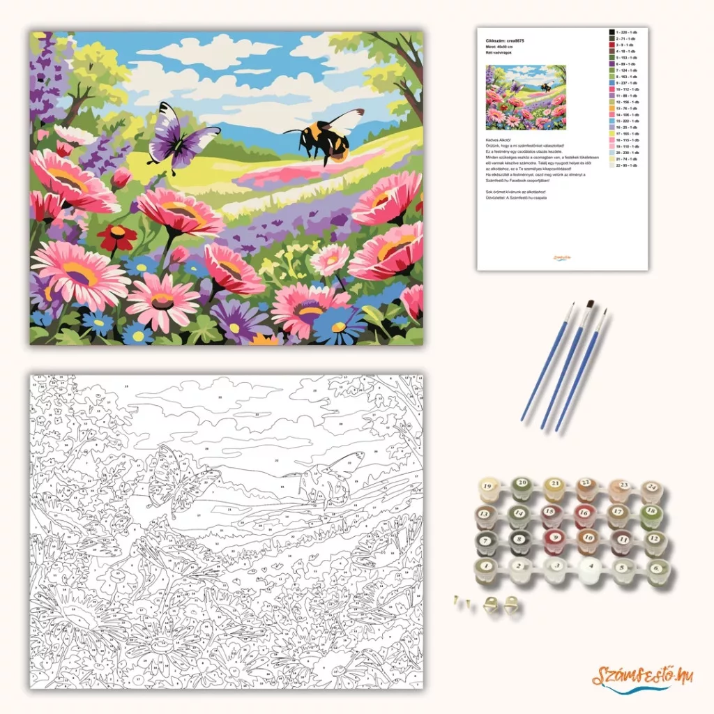 Egy tavaszi virágmező tárul elénk, ahol a vadvirágok felett egy poszméh repül, mellette pedig egy pillangó lebeg. A dombok és a felhős ég nyugodt, friss hangulatot ad a jelenetnek. A kép tele van élettel, virágokkal és üde, derűs színekkel. Engedd szabadjára a kreativitásodat, és alkoss egy különleges műalkotást, amely otthonod dísze lehet de egyedi ajándékként is kiváló. A számfestő készletben minden szükséges eszközt megtalálsz a tökéletes végeredményhez.