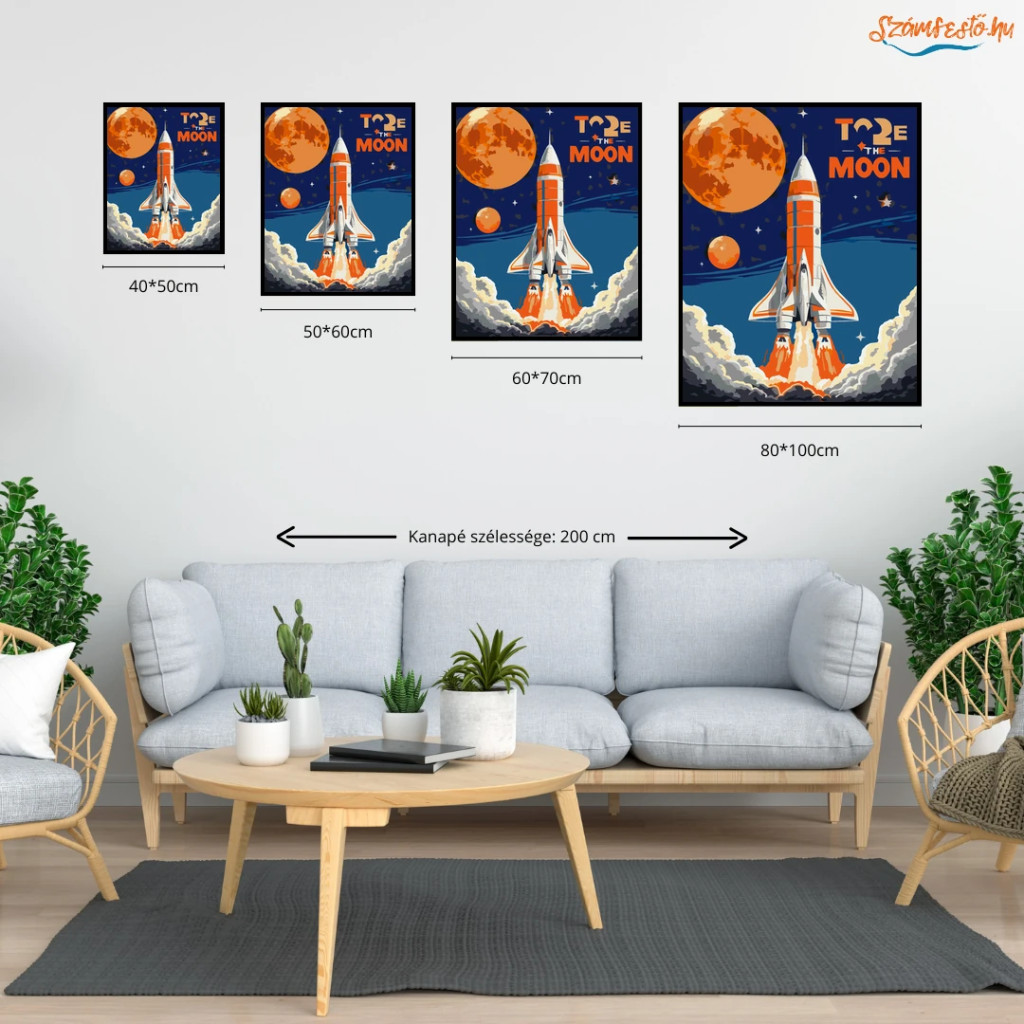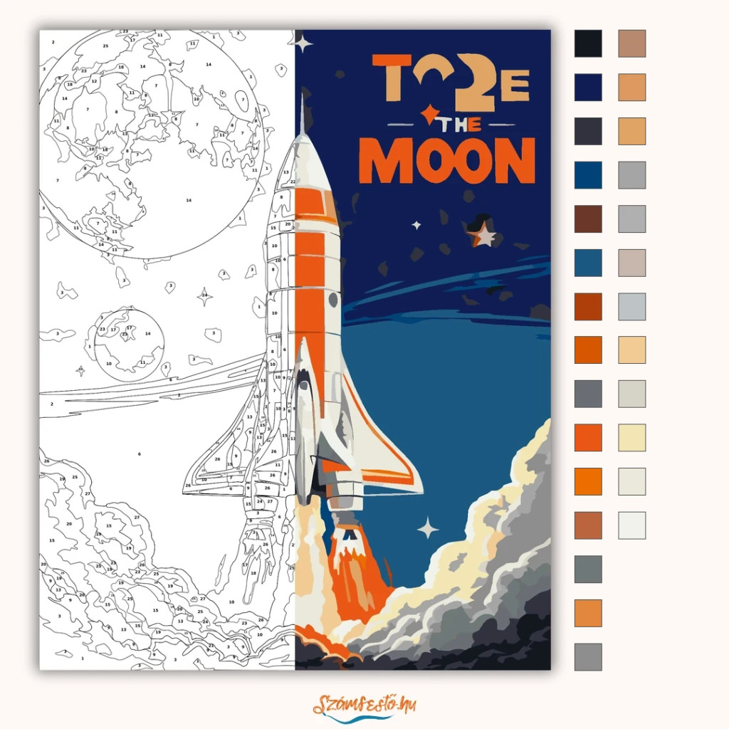 A képen egy vintage rakéta emelkedik fel a felhők közül, körülötte csillagos ég és két nagy, narancsos árnyalatú égitest látható. A jobb felső sarokban a „TO THE MOON” felirat ad lendületes, retro hangulatot. Erőteljes kontrasztok és energikus, űrutazós hangulat jellemzi a jelenetet. Ez a számfestő készlet tökéletes választás, ha egyedi dekorációval tennéd szebbé otthonodat, vagy ha különleges ajándékot keresel. A csomagban minden megtalálható, amire a festéshez szükséged van.