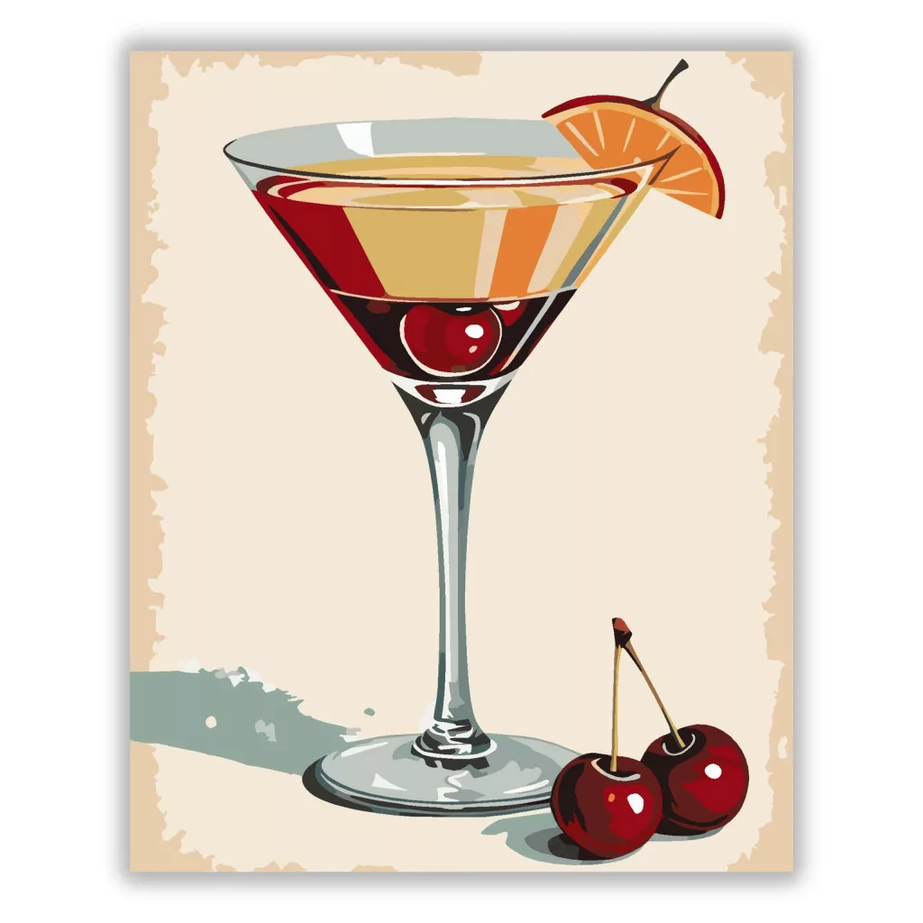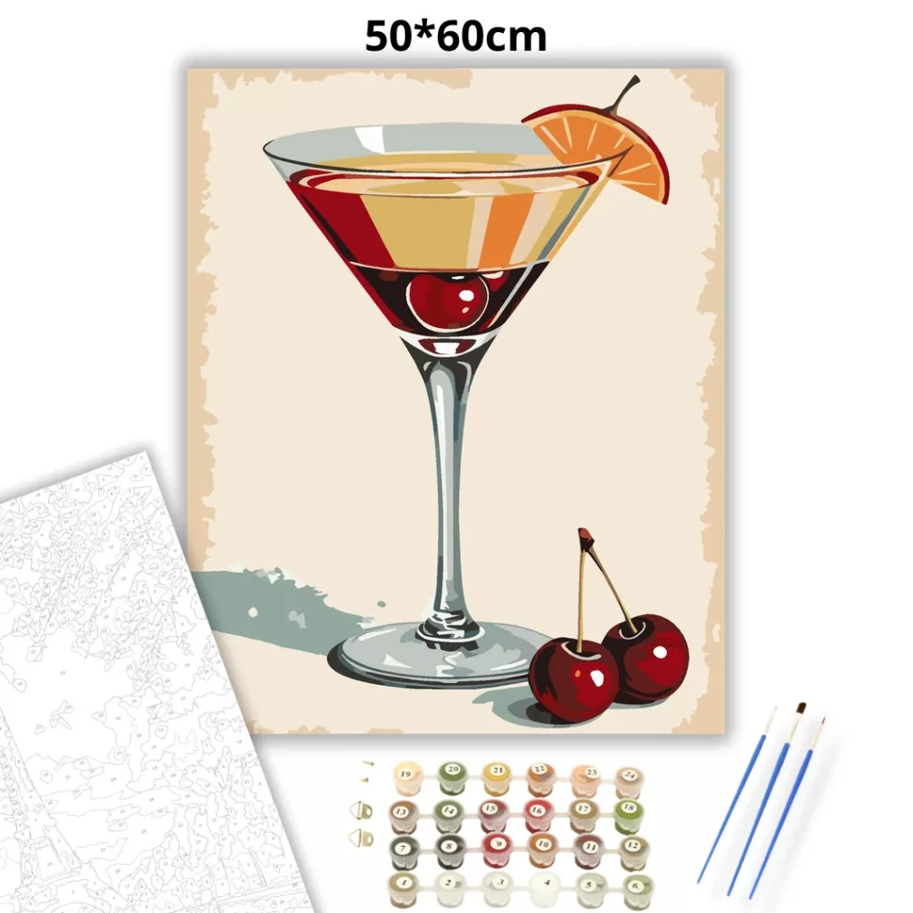 A képen egy klasszikus martinis pohár látható, benne koktéllal és egy cseresznyével. A pohár peremén egy narancsszelet díszít, alul pedig két cseresznye hever. A meleg, retro hangulatú színek elegáns, bárpultos életérzést adnak a látványnak. Ez a számfestő készlet tökéletes választás, ha egyedi dekorációval tennéd szebbé otthonodat, vagy ha különleges ajándékot keresel. A csomagban minden megtalálható, amire a festéshez szükséged van.