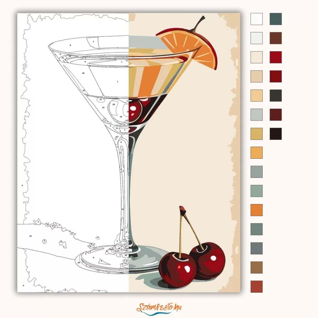 A képen egy klasszikus martinis pohár látható, benne koktéllal és egy cseresznyével. A pohár peremén egy narancsszelet díszít, alul pedig két cseresznye hever. A meleg, retro hangulatú színek elegáns, bárpultos életérzést adnak a látványnak. Díszítsd otthonodat saját kézzel készített műalkotással, vagy ajándékozd meg szeretteidet egy igazán különleges élménnyel! A számfestő készletben minden szükséges eszköz megtalálható a festmény elkészítéséhez.