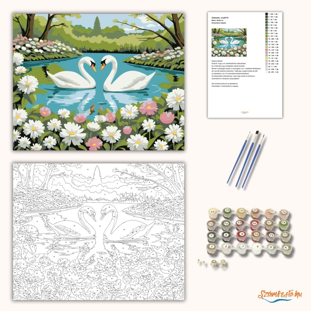 A képen két fehér hattyú úszik egymás felé egy nyugodt tavon, a vízen finom tükröződéssel. A partot tavaszi virágok és dús zöld növények szegélyezik, a háttérben fák és bokrok láthatók. Friss, romantikus hangulatú látvány, sok természetközeli részlettel. Ez a számfestő készlet tökéletes választás, ha egyedi dekorációval tennéd szebbé otthonodat, vagy ha különleges ajándékot keresel. A csomagban minden megtalálható, amire a festéshez szükséged van.